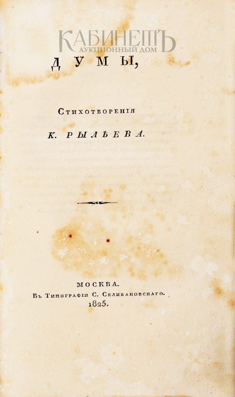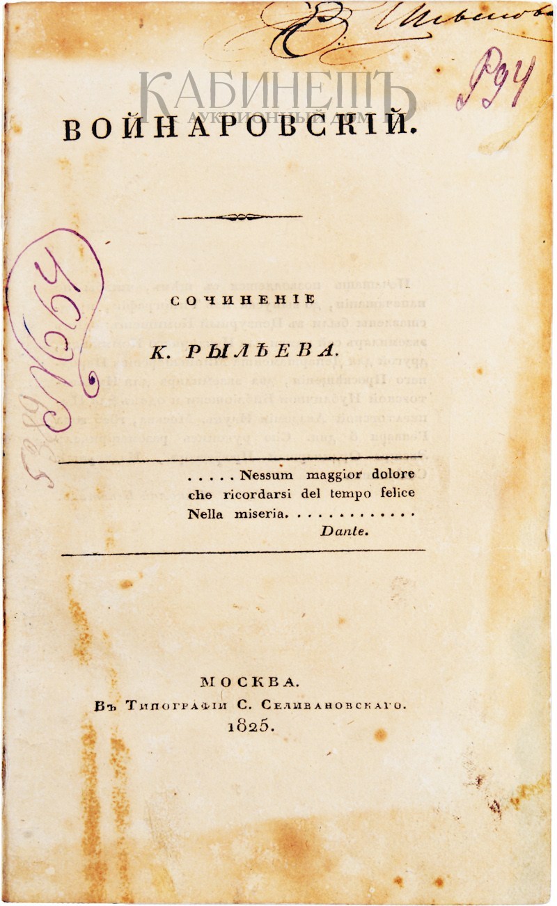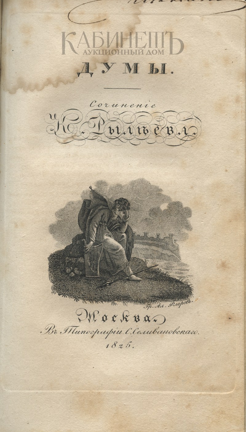 Рылеев Кондратий Федорович (1795 – 1826) – поэт-декабрист, член Северного Общества, один из наиболее активных участников декабрьского восстания. Как поэт, он был известен своими «Думами» и историческими поэмами «Войнаровский», «Наливайко» и др. Его лирические стихотворения представляют собой в русской литературе первые образцы так называемой «гражданской поэзии». Рылеев был казнен вместе с Пестелем, Каховским, Бестужевым-Рюминым и С. Муравьевым-Апостолом 13 июля 1826 г.