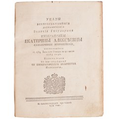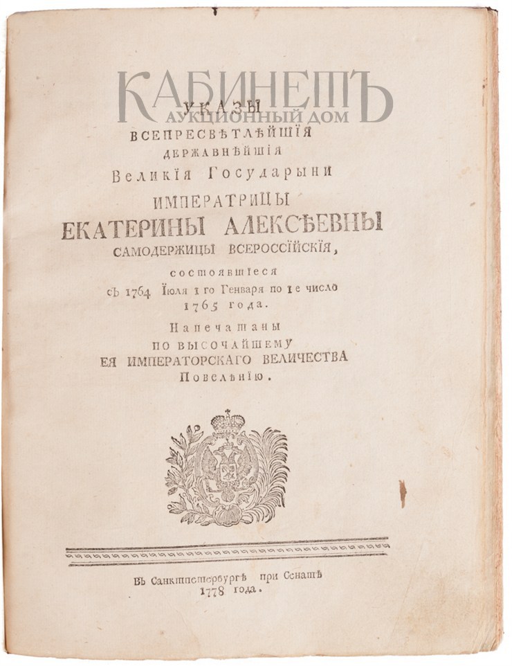 Указы Всепресветлейшей Державнейшей Великой Государыни Императрицы Екатерины Алексеевны Самодержицы Всероссийской, состоявшиеся с 1764 июля 1-го января по 1-е число 1765 года. Напечатаны по Высочайшему Ее Императорского Величества Повелению. СПб., при Сенате, 1778.