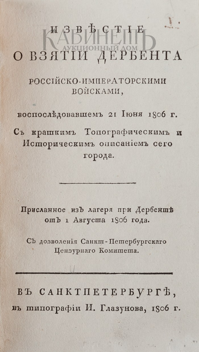 Архив аукциона №13(51) Лот 12 Известие о взятии Дербента российско-