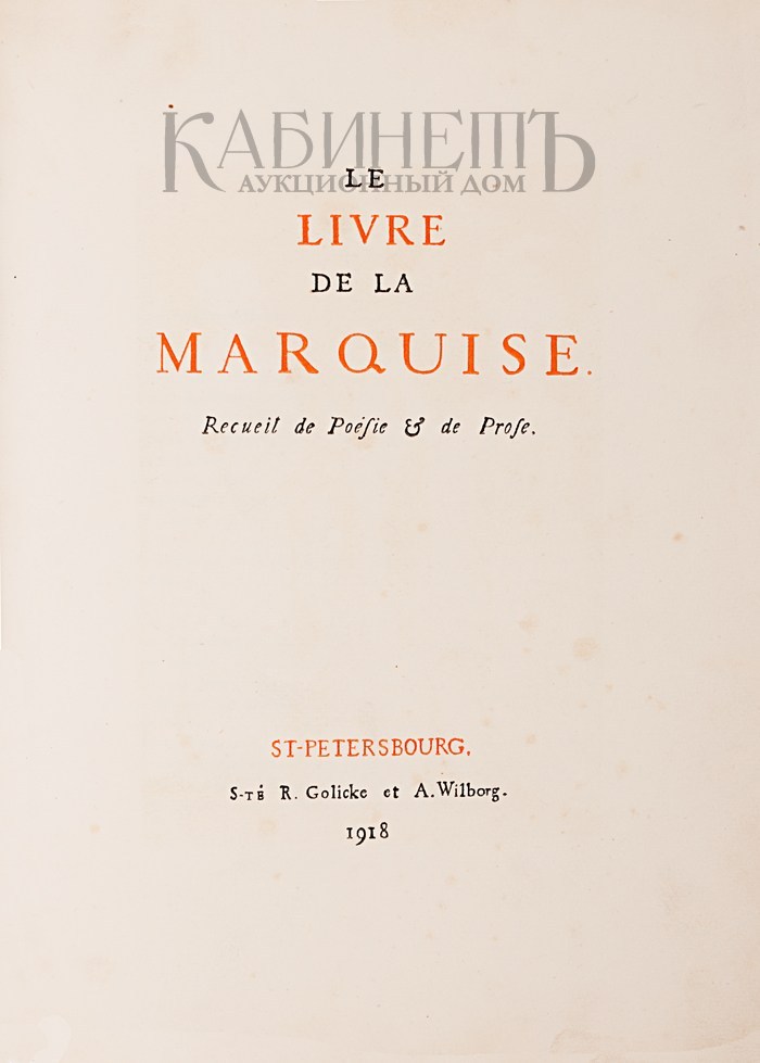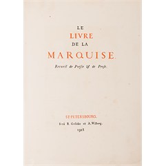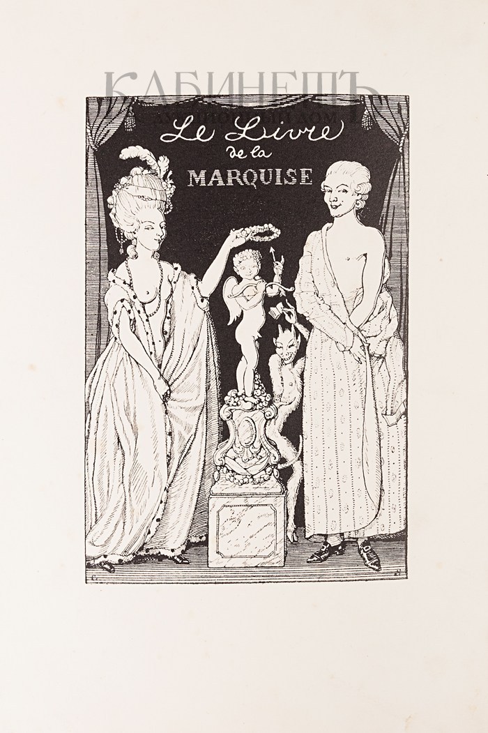 «Книга маркизы»–- уникальное издание, воссоздающее дух эротической литературы Франции XVIII века. В книгу вошли произведения Вольтера, Казановы, Шенье, Парни и многих других авторов. Идея создания антологии принадлежит австрийскому литературному критику Франу Блею и первоначально она была напечатана в 1907 и 1908 гг. в Мюнхене на немецком языке под названием «Das Lesebuch der Marquise». В 1918 г. Сомов решил издать «Книгу маркизы» в более полном варианте. Издание было отпечатано в одной из лучших русских типографий Р. Голике и А. Вильборг и стало последним изданием этой типографии. Книга вышла на французском языке тиражом всего 800 экземпляров. Часть тиража была отпечатана с дополнительными иллюстрациями особенно фривольного содержания и является наиболее редкой. Исключительный интерес в книге представляют иллюстрации Сомова – фронтиспис, шмуцтитул, иллюстрации вне текста, буквицы, заставки, концовки – эротические рисунки пером, раскрашенные впоследствии вручную акварелью, ряд иллюстраций исполнен в технике силуэта. «Книга маркизы» считается вершиной книжной графики К.А. Сомова.