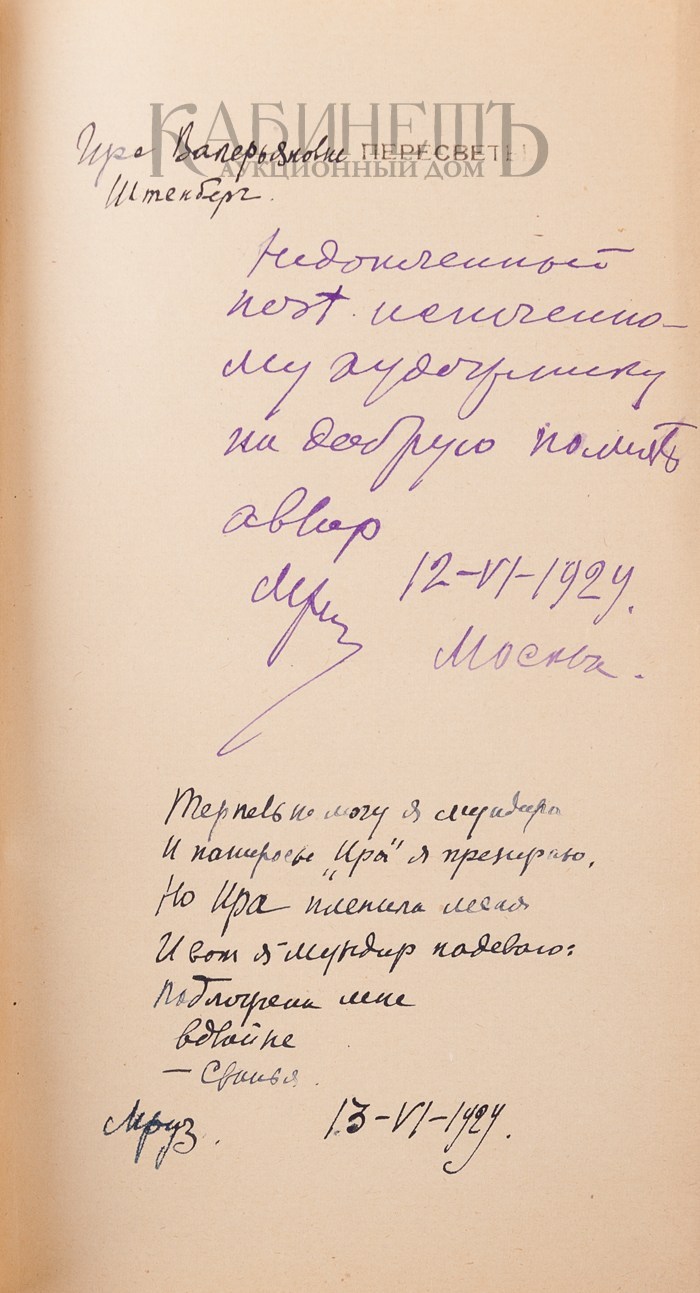 Два автографа Морозова М.В.: «От недопеченного поэта испеченному художнику на добрую память. Автор. 12-VI-1924. Москва»; «Ире Валерьяновне Штенберг. Терпеть не могу я мундиры, и папиросы Ира пленила меня, и вот я мундир надеваю: подложена мне вдвойне – свинья. Мруз. 13-VI-1929».