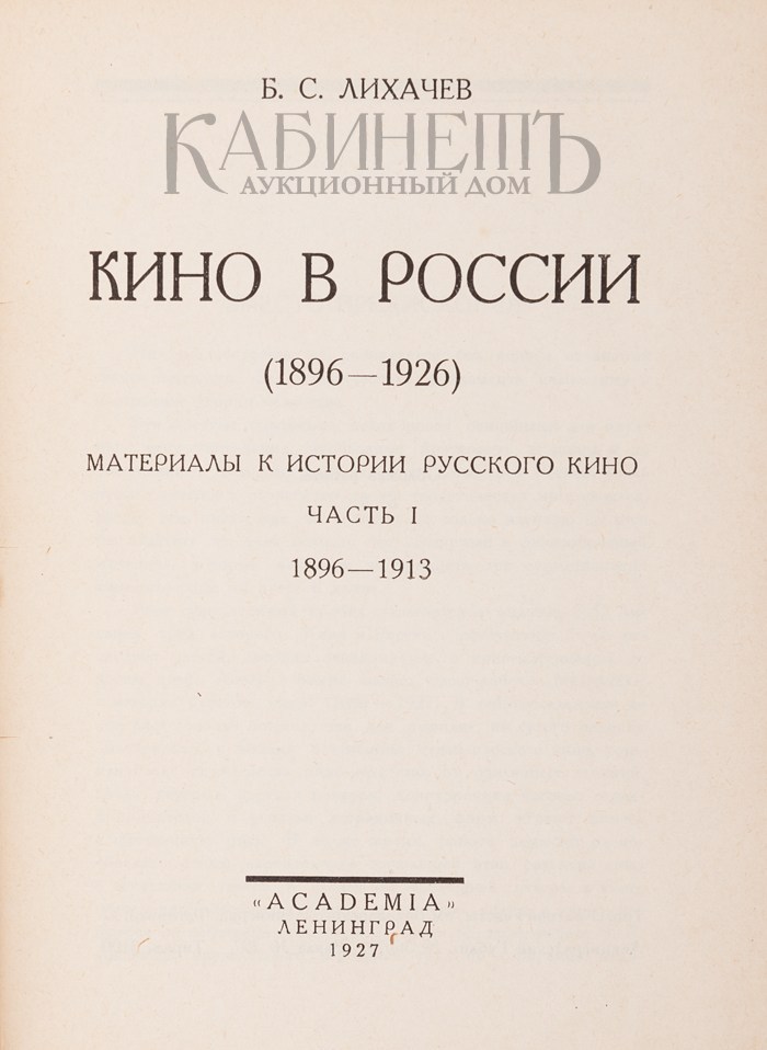 Лихачев Б.С. Кино в России. (1896 – 1926). Материалы к истории русского кино. Часть I: 1896 – 1913. Теория и история кино. Серия книг по основным вопросам кино. Л., «Academia», 1927.