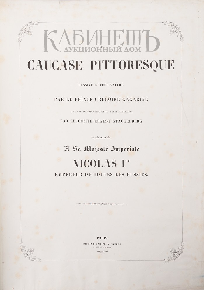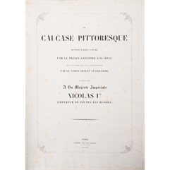 Le Caucase pittoresque. Dessine d`apres nature par Le Prince Gregoire Gagarine avec une introduction et un texte explicatif par le comte Ernest Stackelberg. Dedie a sa Majeste Imperiale Nicolas I-er Empereur de toutes les Russies. Paris, imprime par Plon Freres, 1847. [Живописный Кавказ. Рисунки выполнены с натуры князем Григорием Гагариным, пояснительный текст составлен Эрнестом Штакельбергом. Издание посвящено Его Императорскому Величеству Николаю I Императору Всероссийскому. Париж, типография Братьев Плон, 1847]