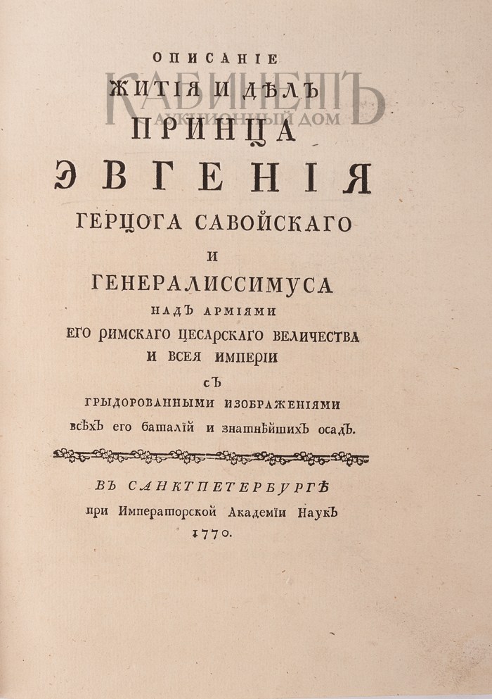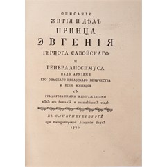 [Перевел И.К.Тауберт]. Описание жития и дел Принца Евгения Герцога Савойского и генералиссимуса над армиями Его Римского Цесарского Величества и всея империи с гравированными изображениями всех его баталий и знатнейших осад. СПб., при Императорской Академии Наук, 1770.