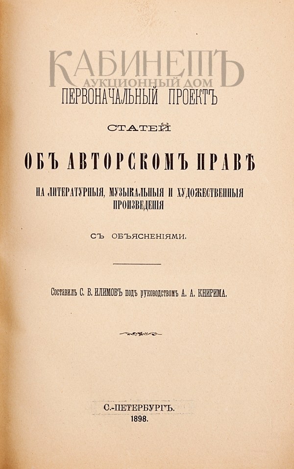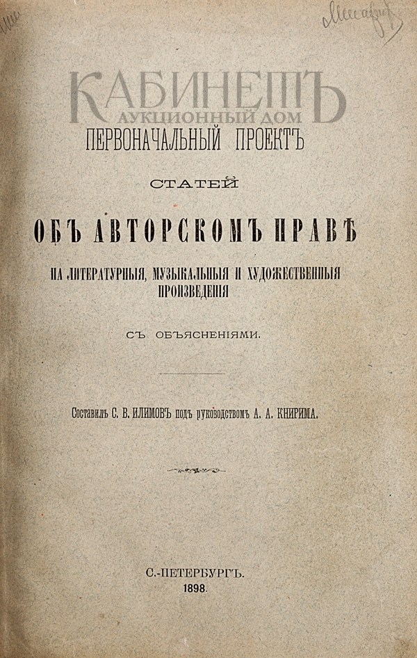 1) Илимов С.В., Книрима А.А. Первоначальный проект статей об авторском праве на литературные, музыкальные и художествененные произведения с объяснениями. Составил С.В. Илимов под руководством А.А. Книрима. СПб., Государственная типография, 1898.