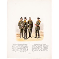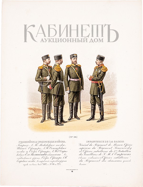 «Гвардейские пехотные войска». (№ 30). Генерал Лейб-Гвардии Московского полка, Штаб–Офицер Лейб-Гвардии Семеновского полка и Обер-Офицер Лейб-Гвардии 1-го Стрелкового Его Величества батальона в обыкновенной форме, Обер-Офицер Лейб-Гвардии Егерьского полка в парадной форме. СПб., Картографическое заведение А. Ильина, [1900-е].