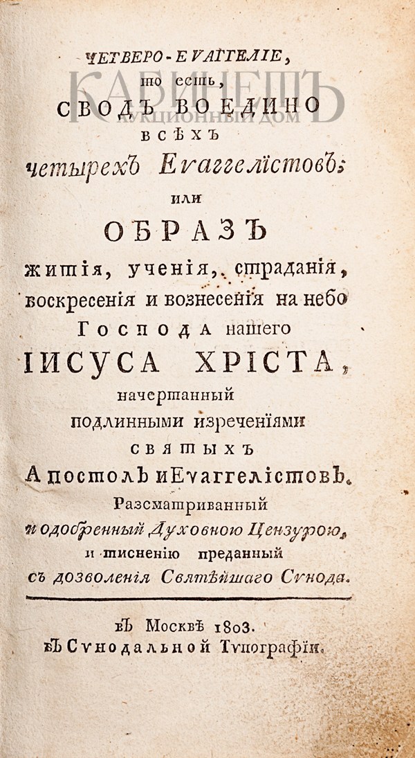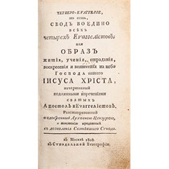 [Чеботарев Х. А.]. Четверо Евангелие, то есть свод воедино всех четырех Евангелистов; или образ жития, учения, страдания, воскресения и вознесения на небо Господа нашего Иисуса Христа, начертанный подлинными изречениями святых Апостолов и Евангелистов. В 2-х частях, в одной книге. М., Синодальная типография, 1803.