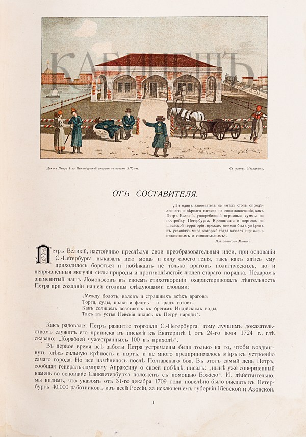 Экземпляр в современном цельнокожаном переплете с золотым тиснением по корешку и верхней крышке. На титульном листе и нескольких страницах расположены дореволюционные штампы: «Чердынская школа ремесленных учеников».