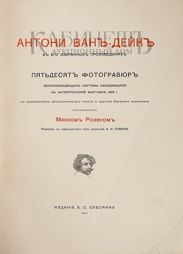 Антонис Ван-Дейк в его избранных произведениях. Пятьдесят фотогравюр, воспроизводящих картины, находившиеся на Антверпенской выставке 1899 г. С приложением объяснительного текста и краткой биографии художника, составленных Максом Розесом. Перевод с французского под редакцией А.И. Сомова. Амстердам, издательское общество «Эльзевир», издание А.С. Суворина, 1901.