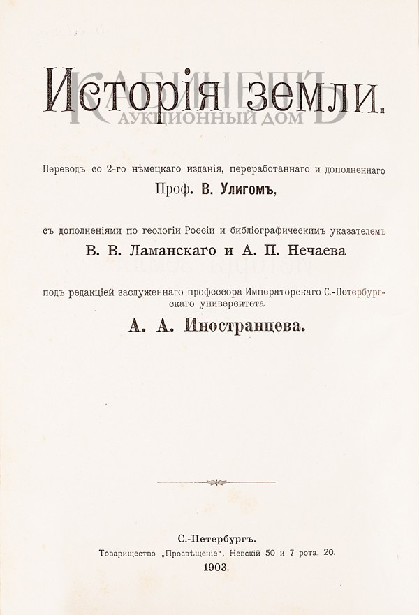 Неймайр М. История земли. В двух томах. Перевод со 2-го немецкого издания, переработанного и дополненного проф. В. Улигом с дополнениями по геологии России и библиографическим указателем В.В. Ламанского и А.П. Нечаева. Под редакцией заслуженного ординарного профессора Императорского С.-Петербургского Университета А.А. Иностранцева. Из серии «Вся природа». СПб., «Провещение», 1902-1903.