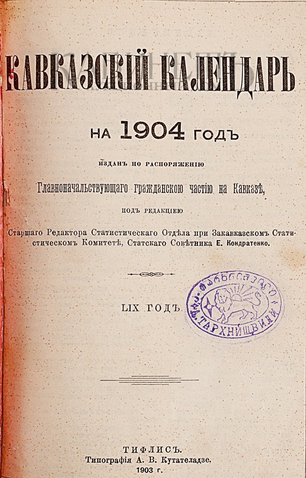 Кавказский календарь на 1904 год. Издан по распоряжению Главноначальствующего гражданской частью на Кавказе. Тифлис, Типография А.В. Кутателадзе, 1903.