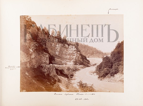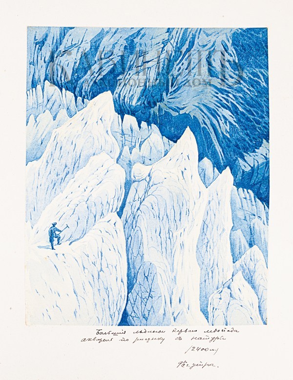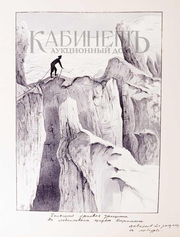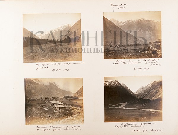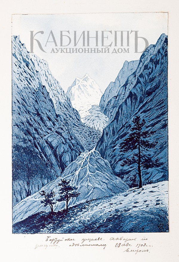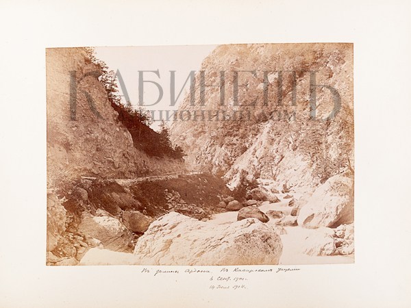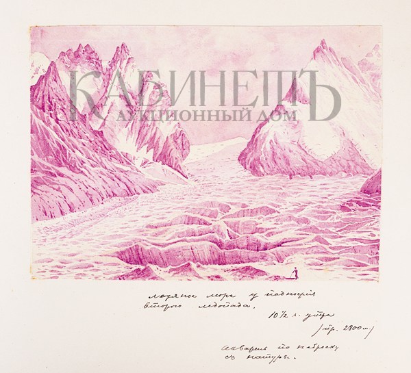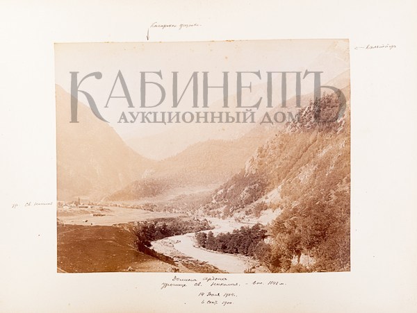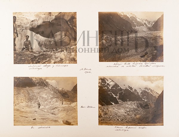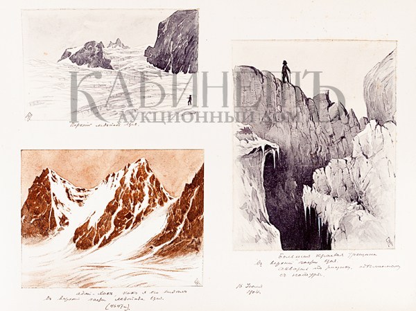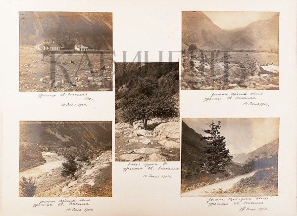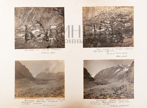 Альбом из библиотеки основателя русского альпинизма А.К. фон Мекка. Фотографии и рисунки, содержащиеся в альбоме, выполнены с натуры известным альпинистом Н.В. Поггенполем. Все фотографии и рисунки имеют подробные пояснительные надписи, даты, указания места, номенклатуры горных вершин и прочее, выполненные рукой Н.В. Поггенполя.
