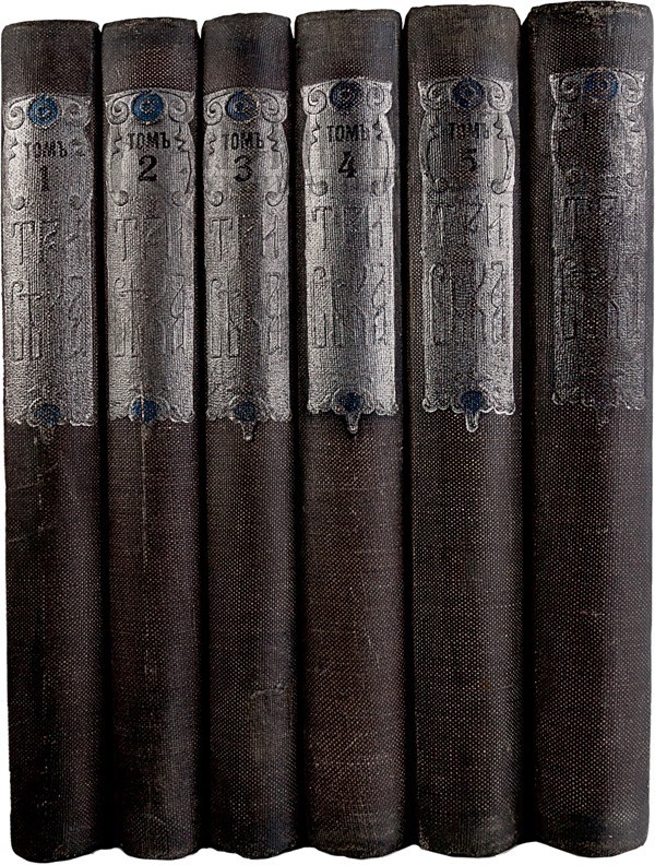 Экземпляр в издательских коленкоровых переплетах с конгревным тиснением шапки Мономаха, скипетра и державы по верхней крышке и полихромным тиснением по корешку и цветным обрезом страниц. В томе 4 разлом по корешку внутри переплета.