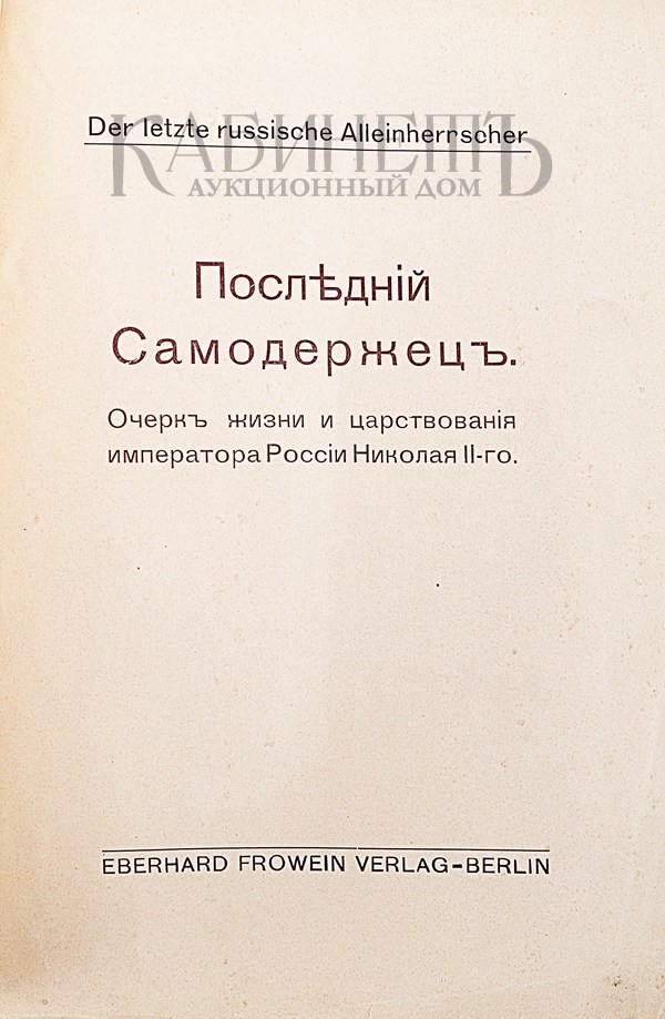 [Обнинский В.П.]. Последний самодержец. Очерк жизни и царствования императора России Николая II- го. Берлин, издание «Eberhard Frowein», [1912].