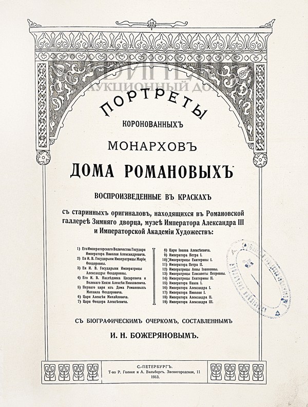 Портреты коронованных монархов Дома Романовых, воспроизведенные в красках со старинных оригиналов, находящихся в Романовской галерее Зимнего Дворца, музее Императора Александра III и Императорской Академии Художеств. С биографическим очерком, составленным И.Н. Божеряновым. СПб., Т-во Р. Голике и А. Вильборг, 1913.