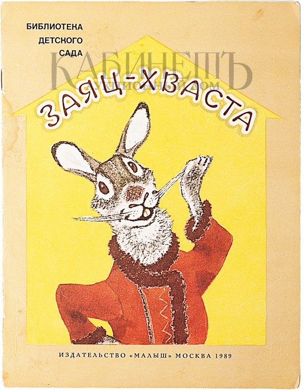 4) Заяц–Хваста. Русская народная сказка в обработке А. Толстого. Серия «Библиотека детского сада». М., издательство «Малыш», 1989. Формат издания: 28 х 21,5 см. 8 с. Рисунки художника Е. Рачева.