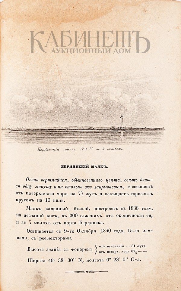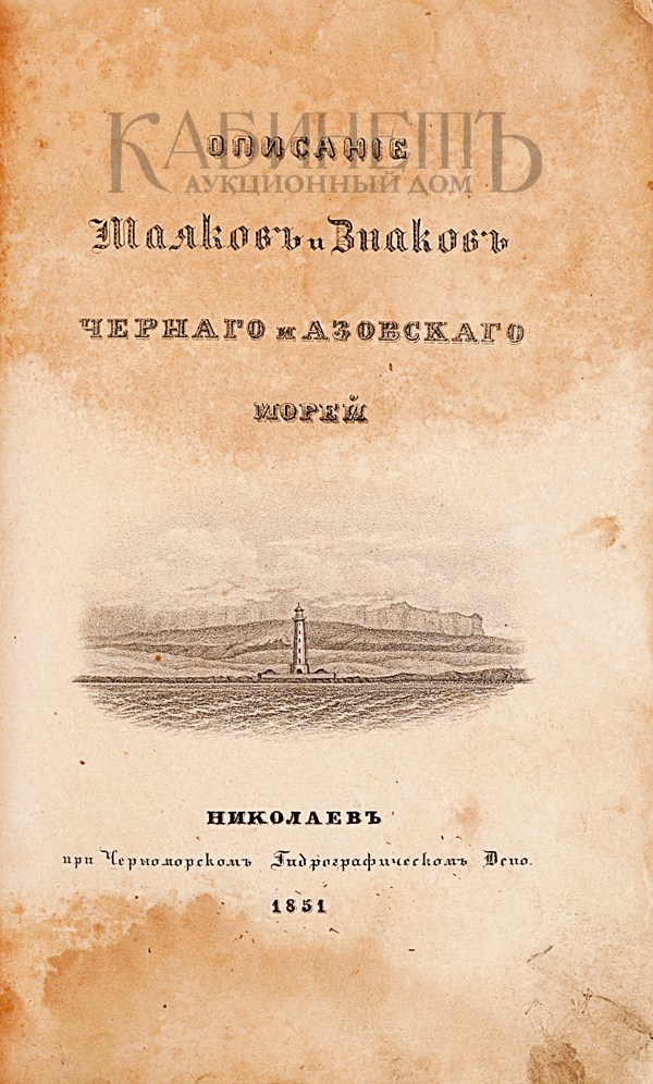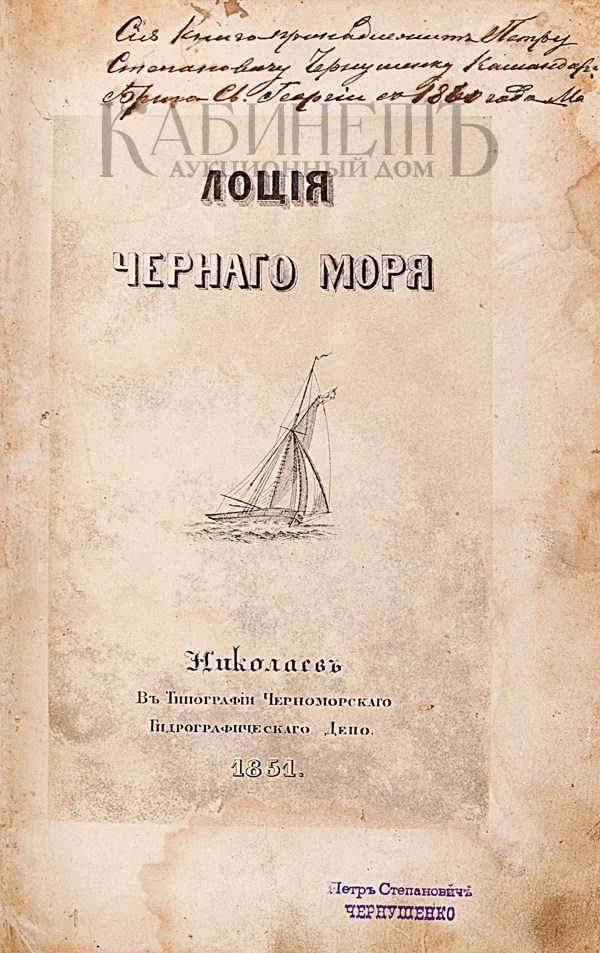 1. Лоция Черного моря. Николаев, В типографии Черноморского Гидрографического Депо, 1851. Формат издания: 24 х 15 см. XII, 472 с. Экземпляр капитана брига «Святой Георгий» Петра Степановича Чернушенко. Редкость!