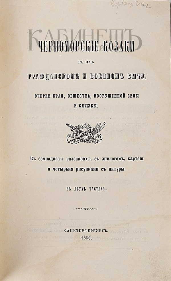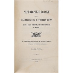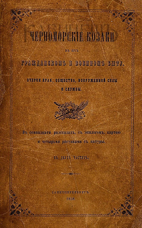 Черноморские казаки в их гражданском и военном быту. Очерки края, общества, вооруженной силы и службы. В семнадцати рассказах, с эпилогом, картою и четырьмя рисунками с натуры. В двух частях в одном переплете. СПб., типография П.А. Кулина, 1858.
