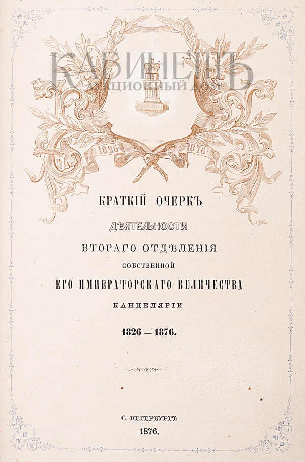 Краткий очерк деятельности второго отделения собственной Его Императорского Величества канцелярии 1826–1876. Список чинам второго отделения собственной Его Императорского Величества канцелярии 1826–1876. СПб., в типографии Второго Отделения Собственной Е.И.В. Канцелярии, 1876.