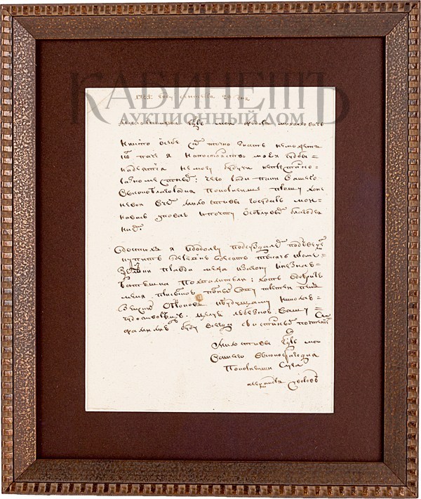 Размер письма: 22 х 16,5 см. Размер рамки: 32,5 х 28 см. [1] с. Исключительная редкость! Подлинное письмо-автограф из утраченного в 1784 году архива хозяйственных документов А.В. Суворова.