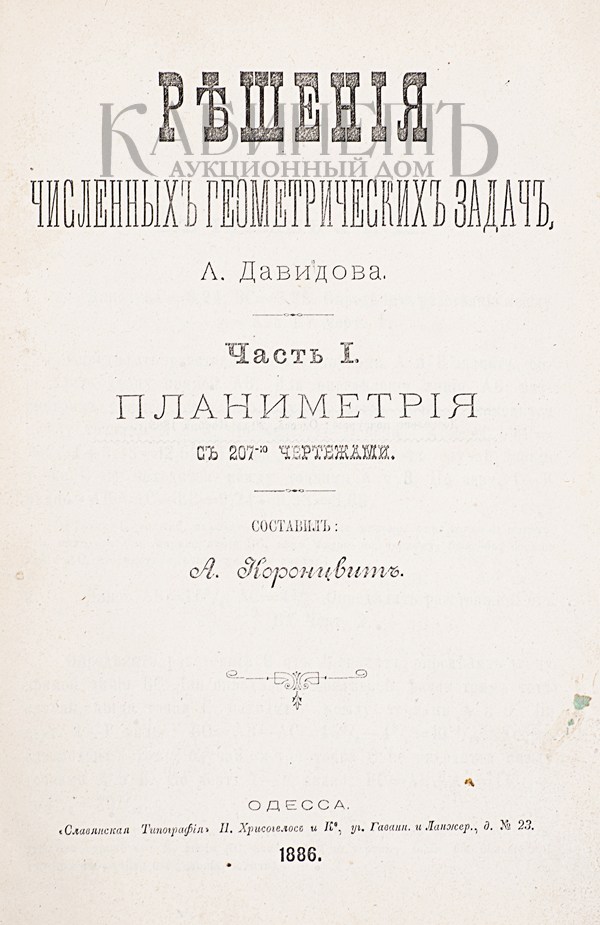 Коронивит А. Решения численных геометрических задач А. Давидова. Часть I. Планиметрия. С 207 чертежами. Одесса, «Славянская типография» Н. Хрисогелос и К°, 1886.