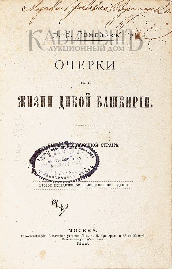 Ремизов Н.В. Очерк из жизни дикой Башкирии. Быль в сказочной стране. Второе исправленное и дополненное издание. М., Типо-литография Товарищества И.Н. Кушнерева и Ко, 1889.