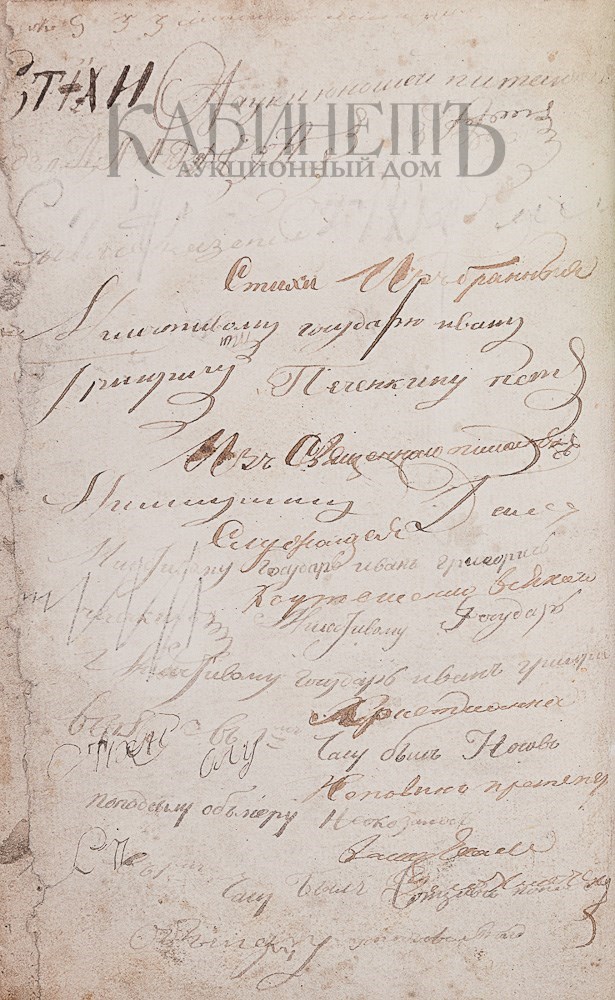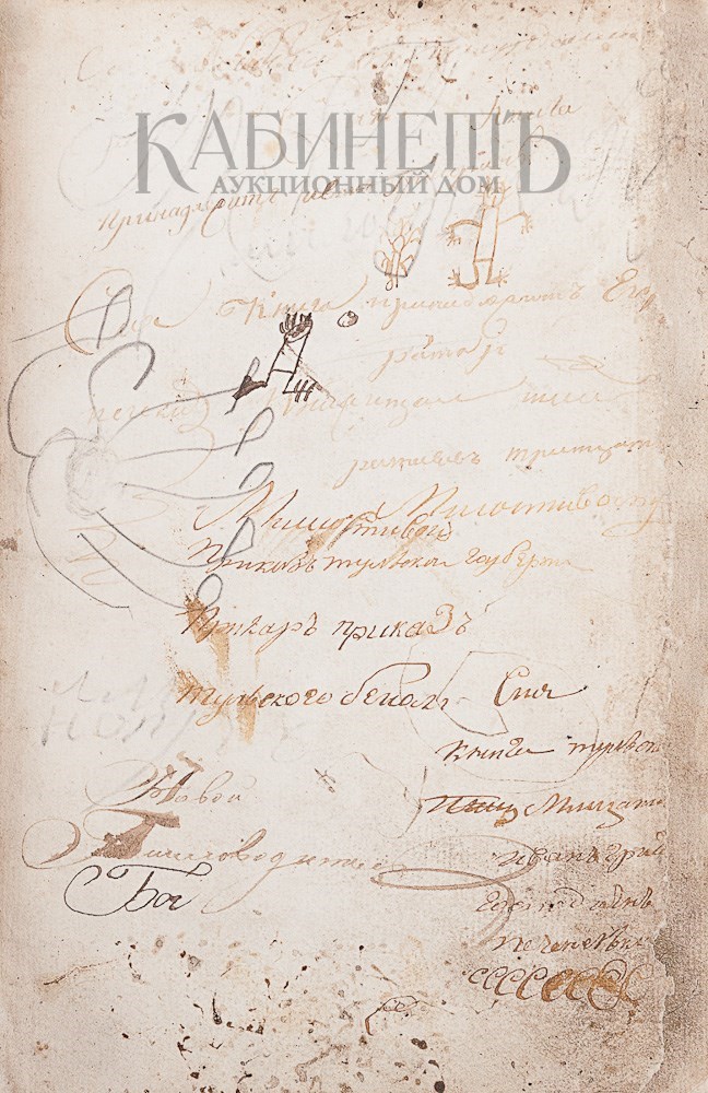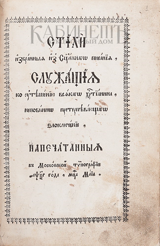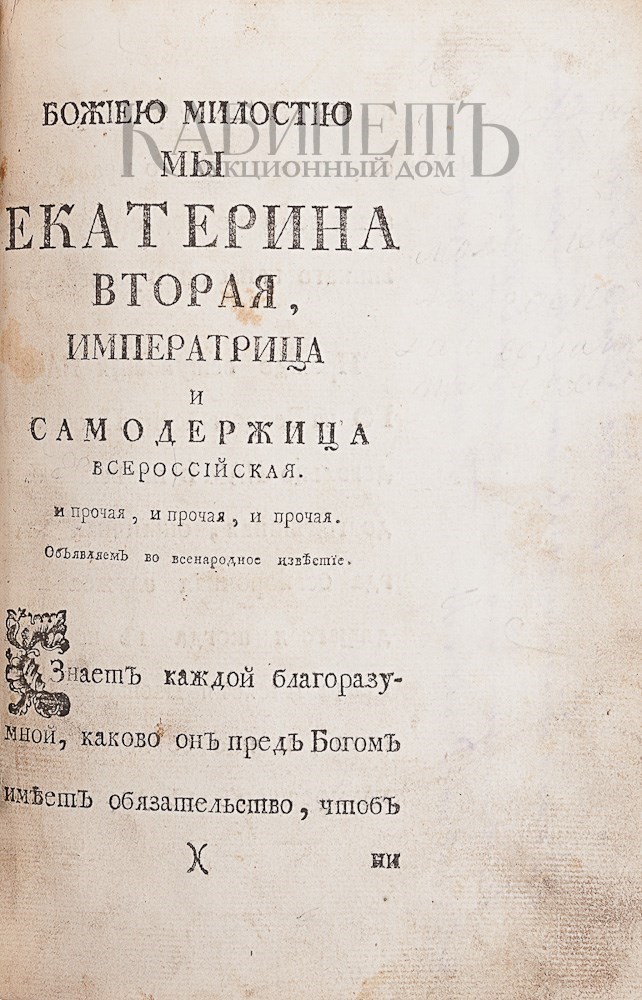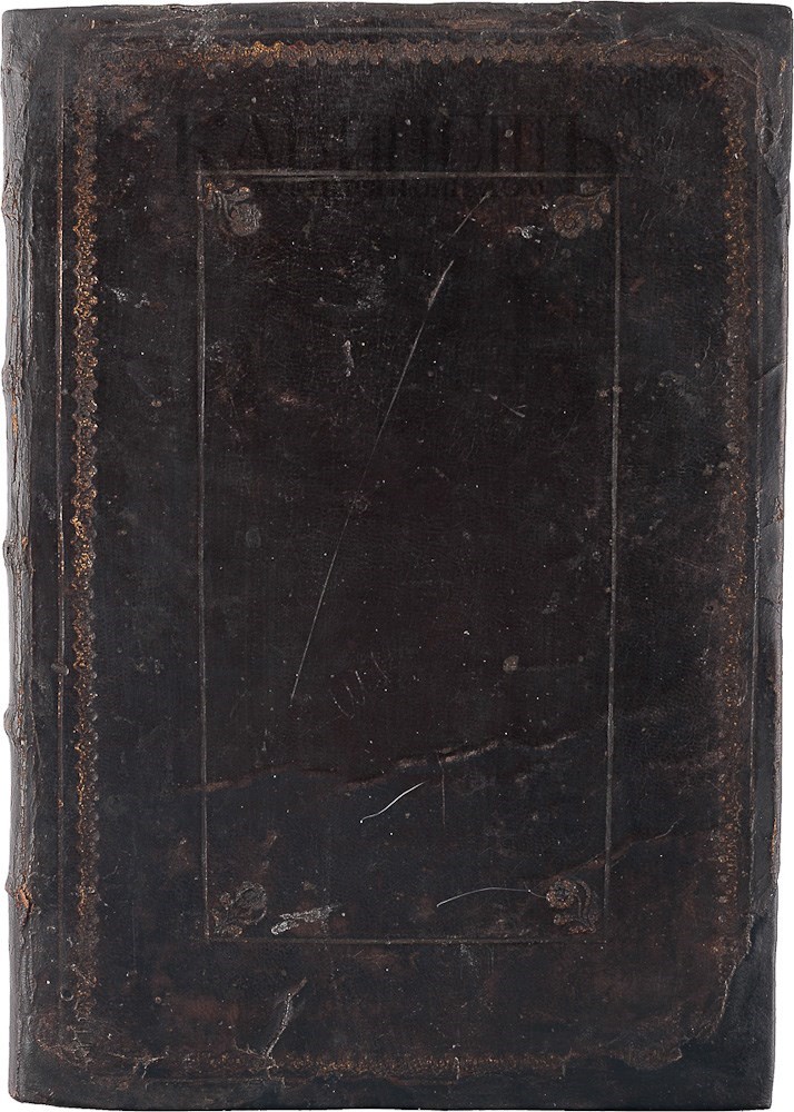 Экземпляр в старинном полукожаном переплете начала XIX века, с золотым тиснением по корешку и крышкам, в очень хорошей сохранности, незначительные загрязнения страниц (залистывание), несколько страниц фрагментарно реставрированы по краям, владельческие пометки орешковыми чернилами на форзаце, нахзаце и последней странице манифеста.