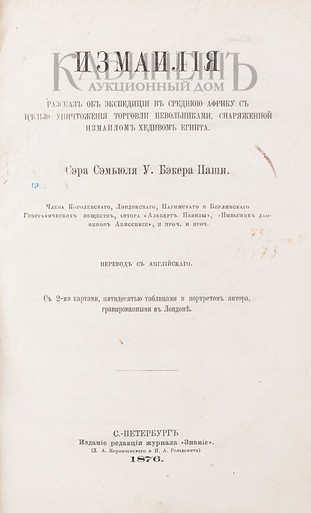 Сэмьюль У. Бэкер Паша. Измаилия. Рассказ об экспедиции в Среднюю Африку с целью уничтожения торговли невольниками, снаряженной Измаилом Хедивом Египта. Пер. с англ. С 2-мя картами, пятьюдесятью таблицами и портретом автора, гравированными в Лондоне. СПб., издание редакции журнала «Знание», 1876.