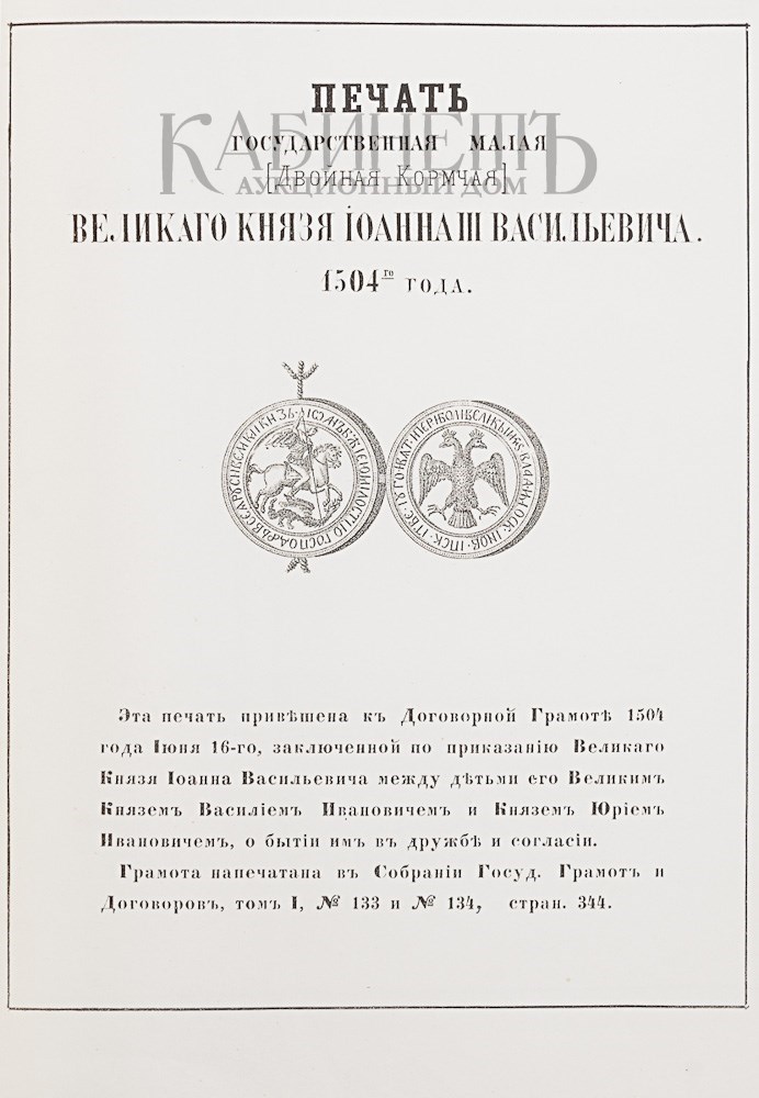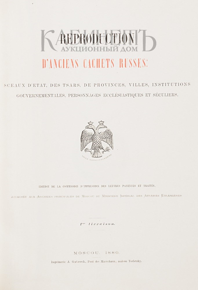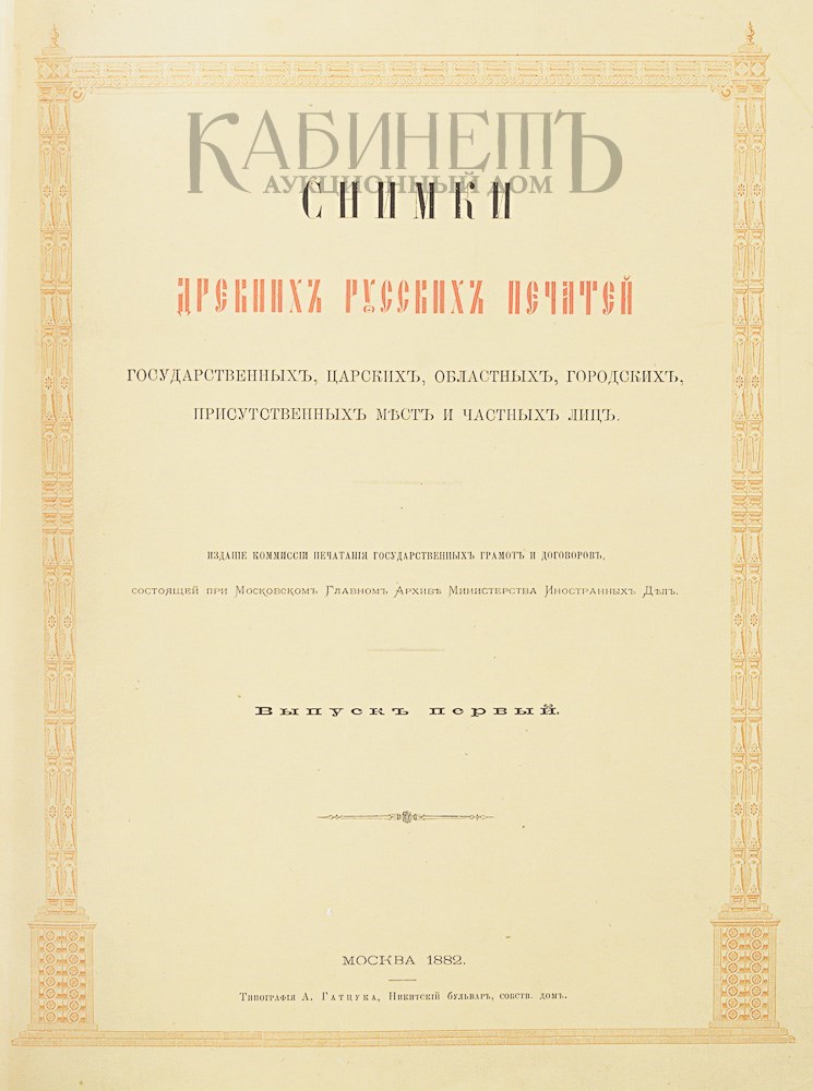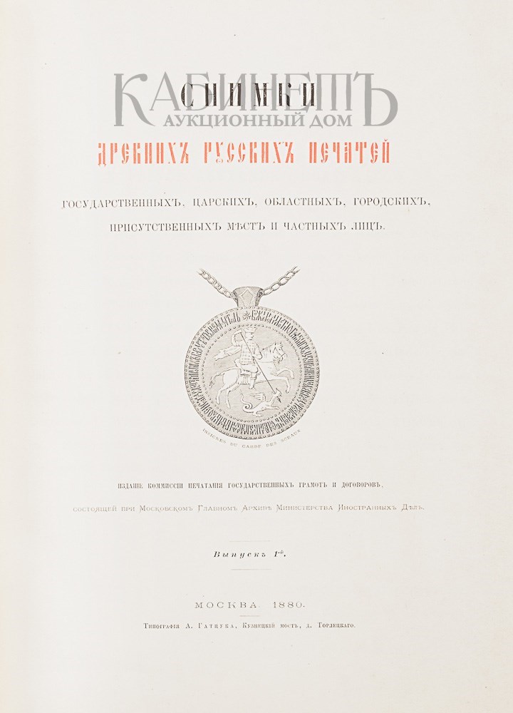 Снимки древних русских печатей государственных, царских, областных, городских, присутственных мест и частных лиц. Издание Комиссии печатания государственных грамот и договоров, состоящей при Московском Главном Архиве Министерства Иностранных Дел. Выпуск первый. М., Типография А. Гатцука, 1880 (1882).