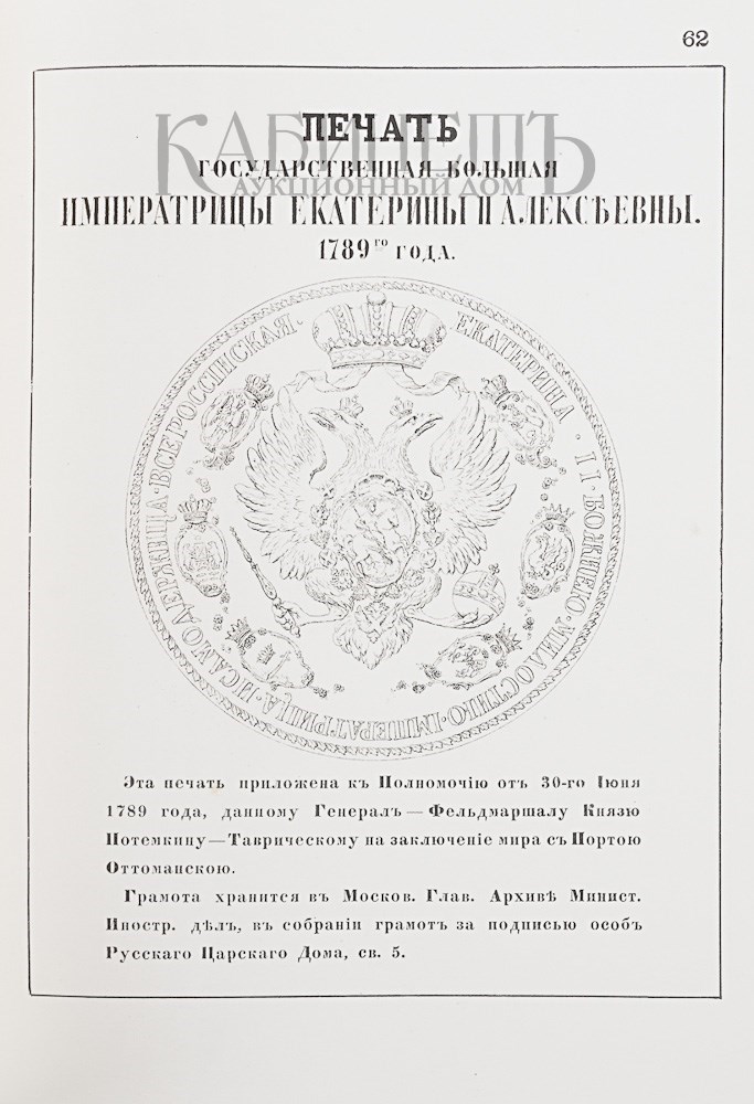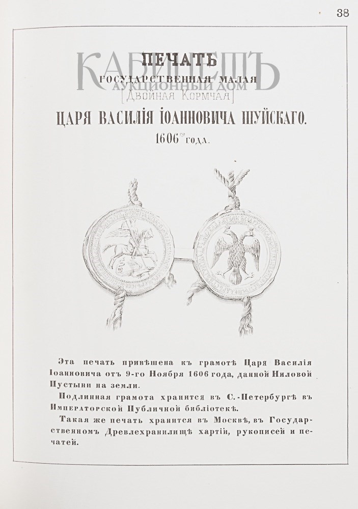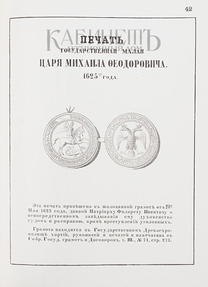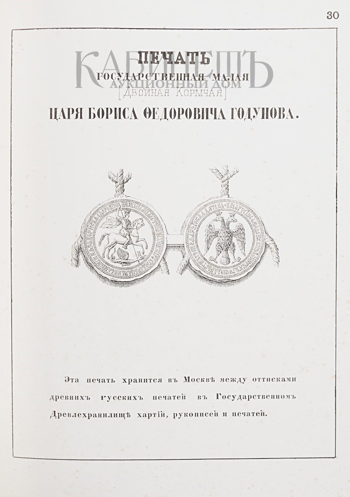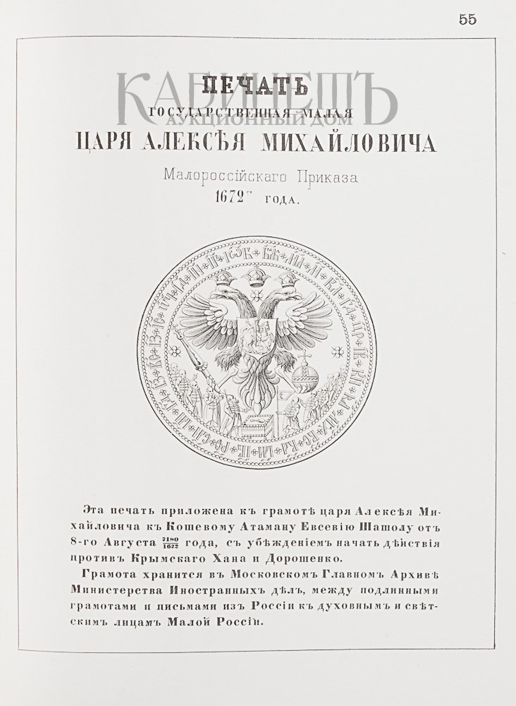 Снимки древних русских печатей государственных, царских, областных, городских, присутственных мест и частных лиц. Издание Комиссии печатания государственных грамот и договоров, состоящей при Московском Главном Архиве Министерства Иностранных Дел. Выпуск первый. М., Типография А. Гатцука, 1880 (1882).