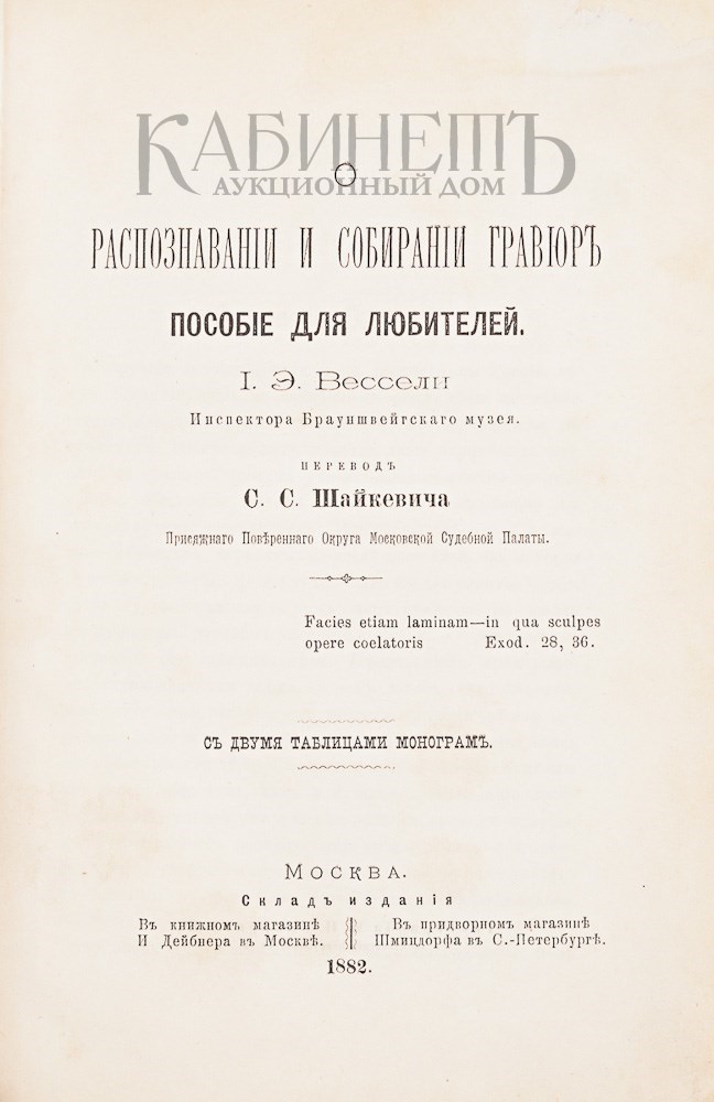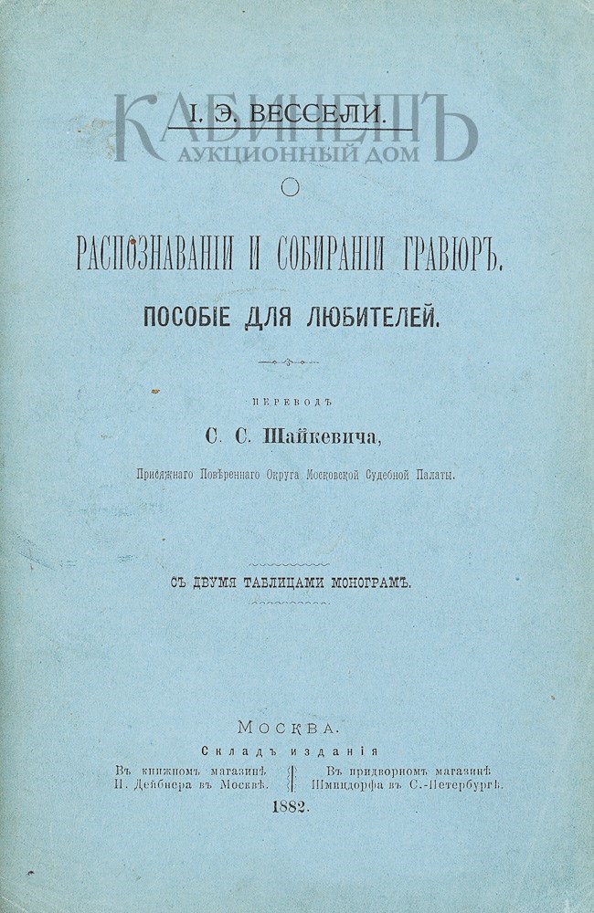 Вессели И. Э. О распознании и собирании гравюр. Пособие для любителей. Перевод С.С. Шайкевича. С двумя таблицами монограмм. М., типография М.Н. Лаврова и Ко, 1882.
