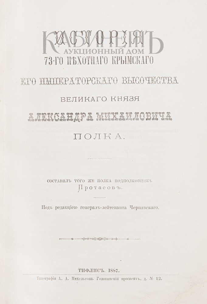 [Протасов М. Д.] История 73-го пехотного Крымского Его Императорского Высочества Великого Князя Александра Михайловича полка. Сост. того же полка подполковник Протасов. Под ред. Генерал-лейтенанта Чернявского. Тифлис, тип. А. А. Михельсона, 1887.