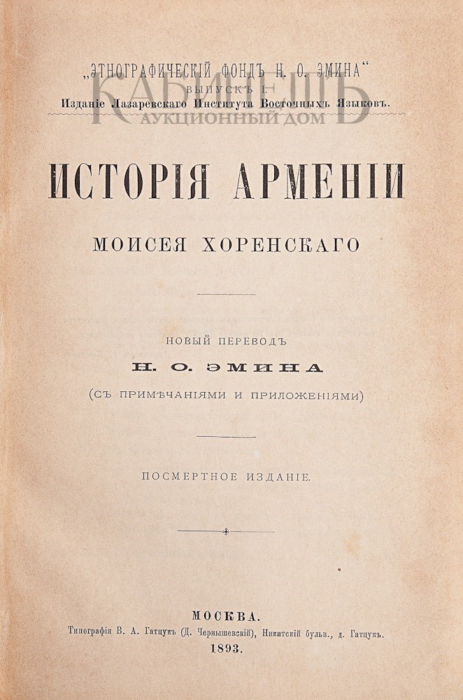 Хоренский М. История Армении. Новый перевод Н.О. Эмина. (С примечаниями и приложениями). Посмертное издание. М., типография В.А. Гатцук (Д. Чернышевский), 1893.