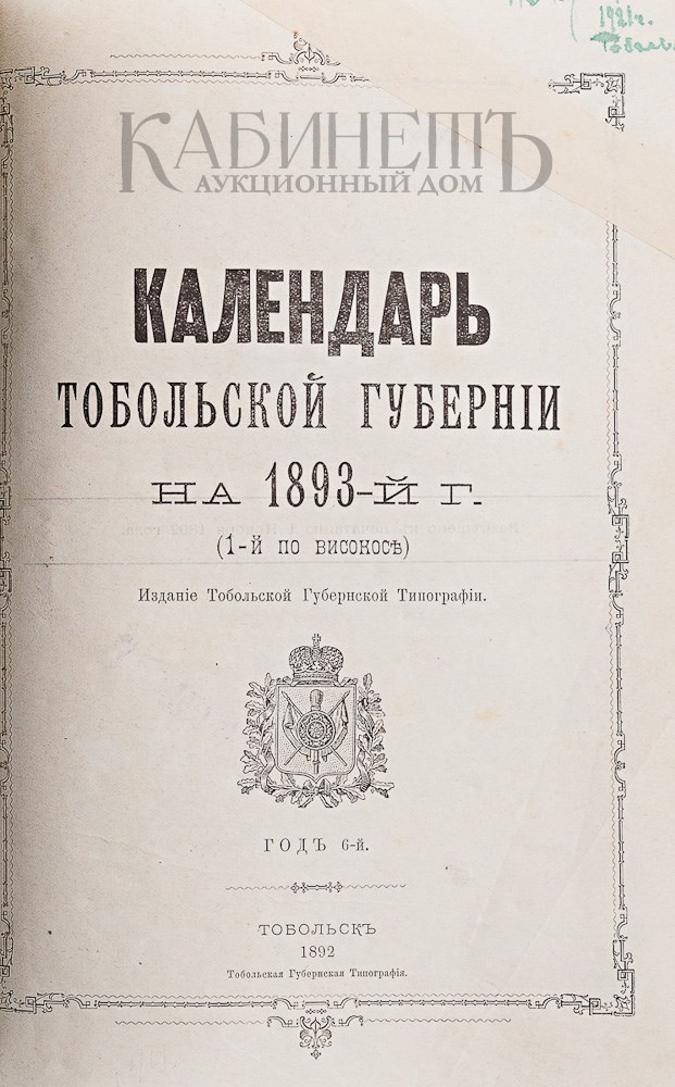 Календарь Тобольской губернии на 1893-й г. (1-й по високосе). Тобольск, Тобольская Губернская Типография, 1892.