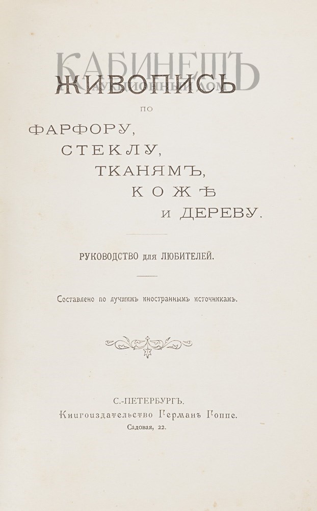 Живопись по фарфору, стеклу, тканям, коже и дереву. Руководство для любителей. Составлено по лучшим иностранным источникам. СПб., книгоиздательство Герман Гоппе, 1897.