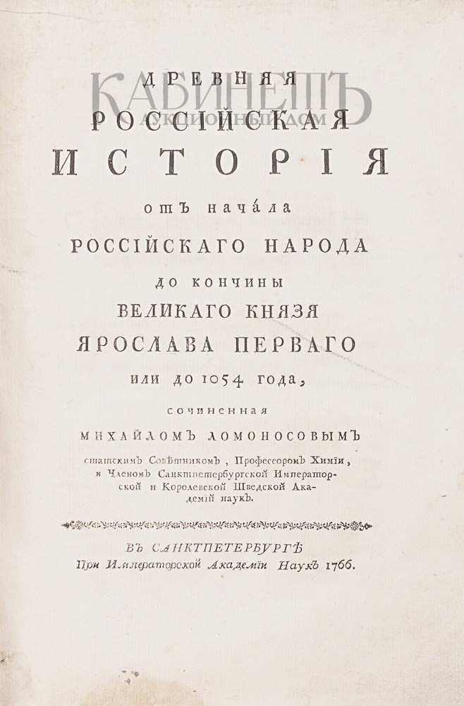 Ломоносов М.В. Древняя Российская История от начала российского народа до кончины Великого Князя Ярослава Первого или до 1054 года, сочинённая Михайлом Ломоносовым статским советником, профессором химии, и членом Санкт-Петербургской Императорской и Королевской Шведской Академии Наук. В 2-х частях. СПб., Императорская Академия Наук, 1766.