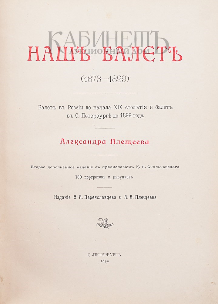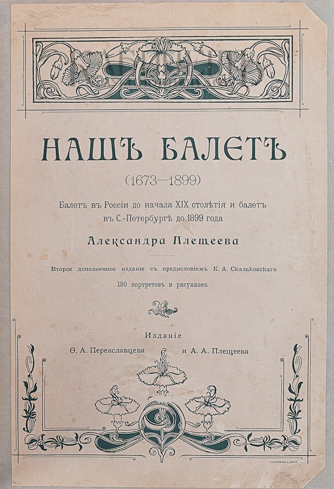 Плещеев А. Наш балет (1673 – 1899). Балет в России до начала XIX столетия и балет в Санкт-Петербурге до 1899 года. Второе дополненное издание с предисловием К. А. Скальковского. 180 портретов и рисунков. СПб., издание Ф.А. Переяславцева и А.А. Плещеева, 1899.