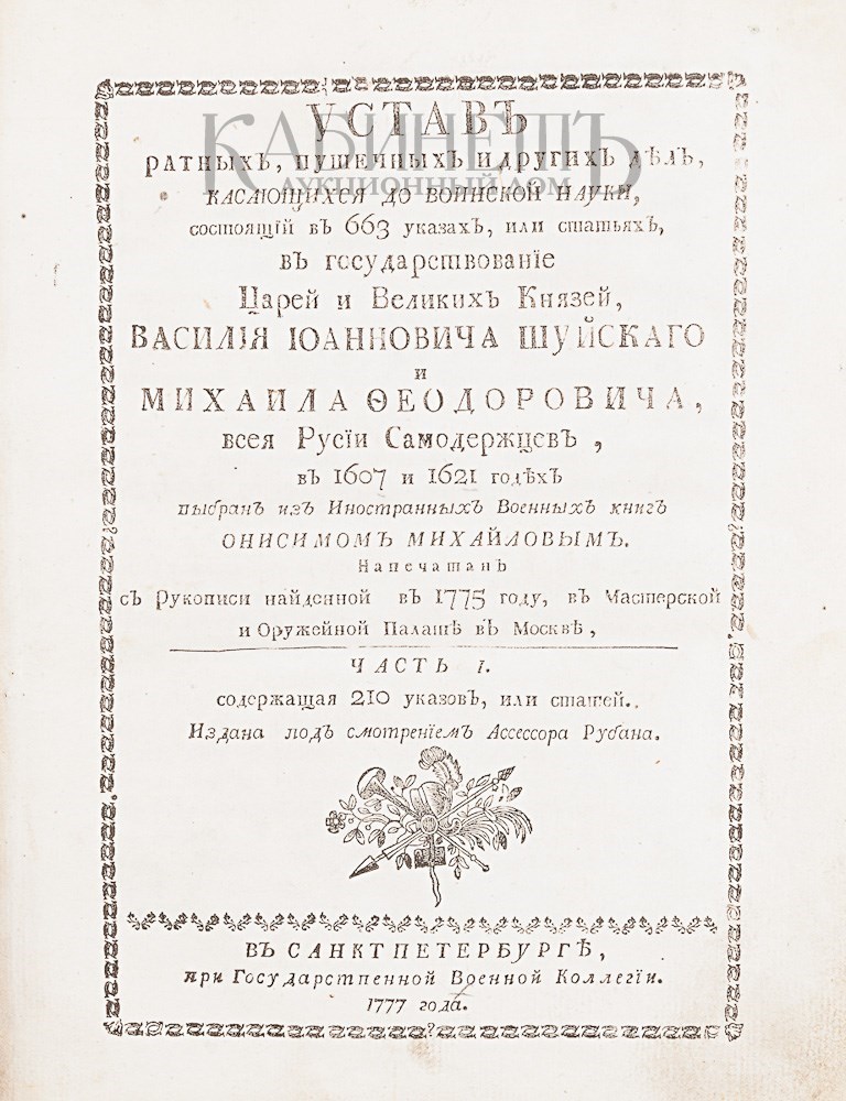 «Устав ратных, пушечных и других дел, касающихся до воинской науки» — воинский устав Московского государства, подготовленный при царе Василии Шуйском в 1607 году. Пришедший к власти после разгрома царской армии сторонниками Лжедмитрия I, новый царь Василий Шуйский видел свою приоритетную задачу в реформировании и модернизации ратного дела на Руси. В связи с развитием огнестрельного оружия произошло резкое изменение методов ведения войны. Именно теоретическое знание и умение использовать новые приёмы на практике могли во многом определить исход боя.