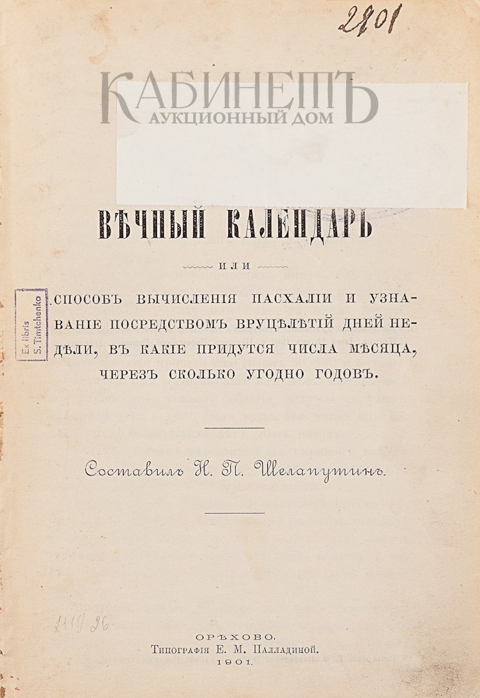 Экземпляр во владельческом картонажном переплете. На титульном и последнем листах штамповый экслибрис: «Ex libris S. Timtchenko».