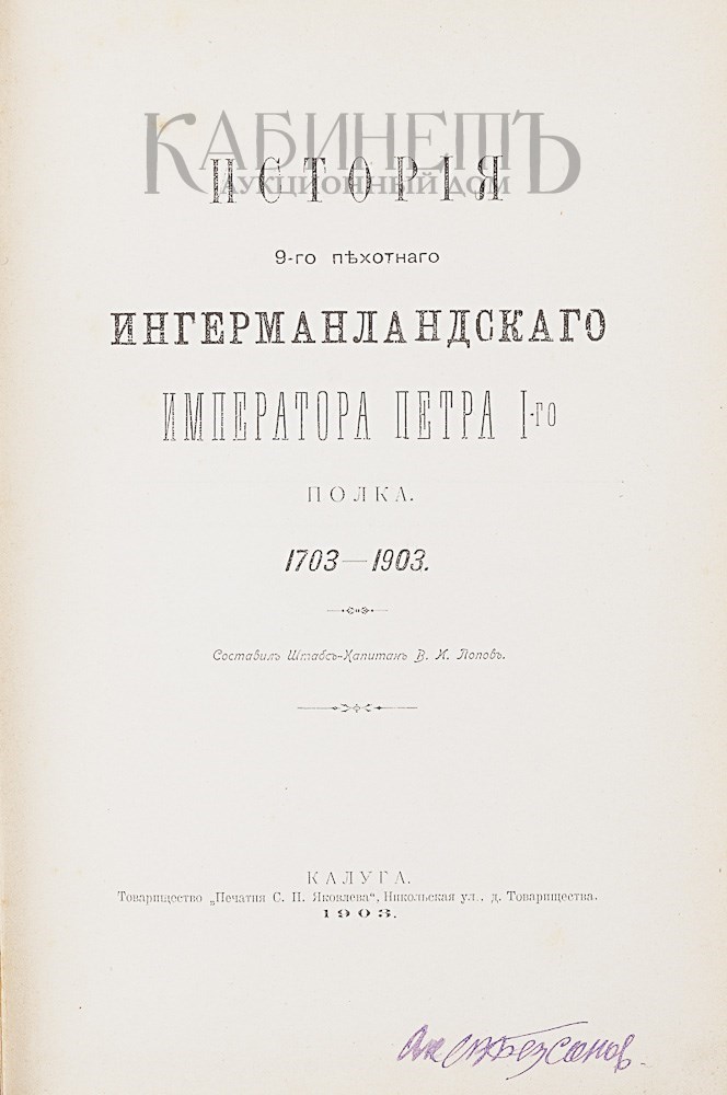Книга посвящена 200-летнему юбилею 9-го Ингерманландского Императора Петра Великого полка. Полк был сформирован по указу Петра I как пехотный Меншикова полк в 1703 году. В 1704 году стал именоваться Ингерманландскии пехотным полком. Принимал участие в Северной войне, Отечественной войне 1812 года, русско-турецких войнах, в подавлении Польского восстания, в Первой мировой войне. Расформирован в 1918 году. В полку в разное время служили: Михаил Херасков, Александр Суворов, Сергей Волконский, Михаил Засулич, Фёдор Зворыкин.