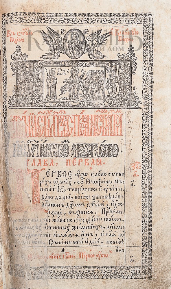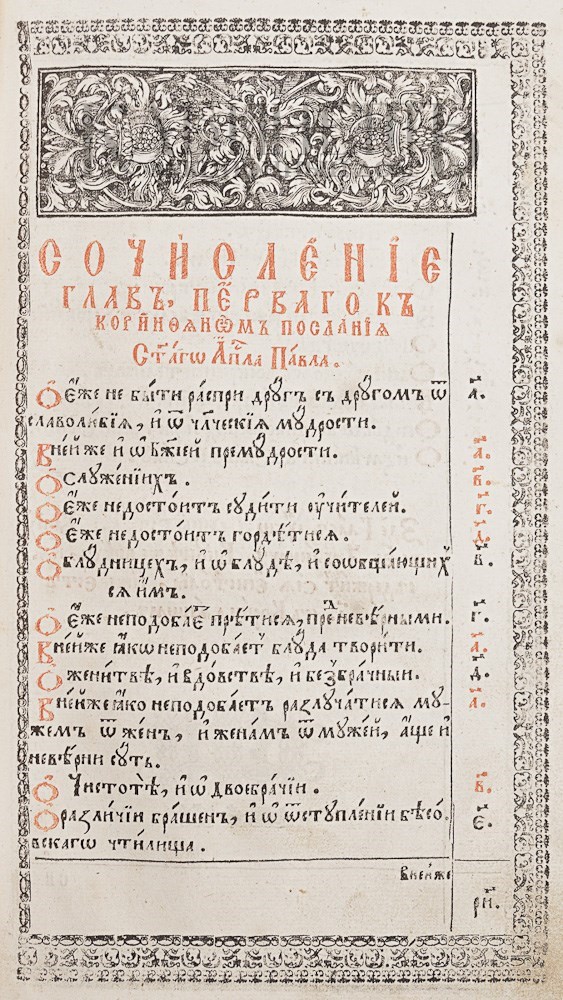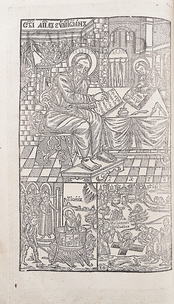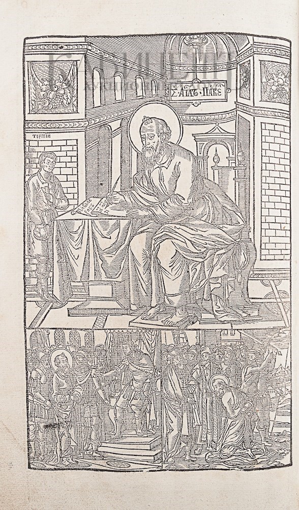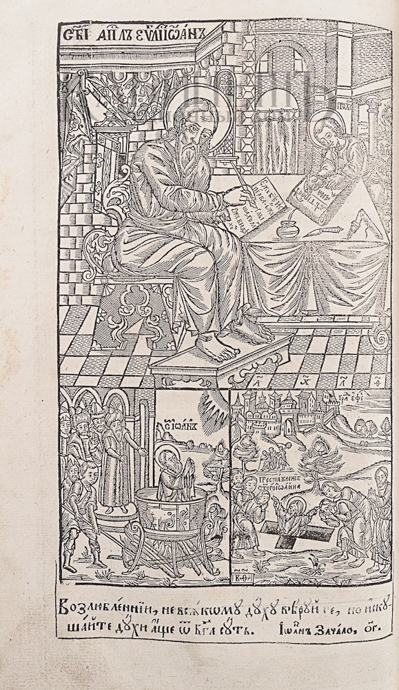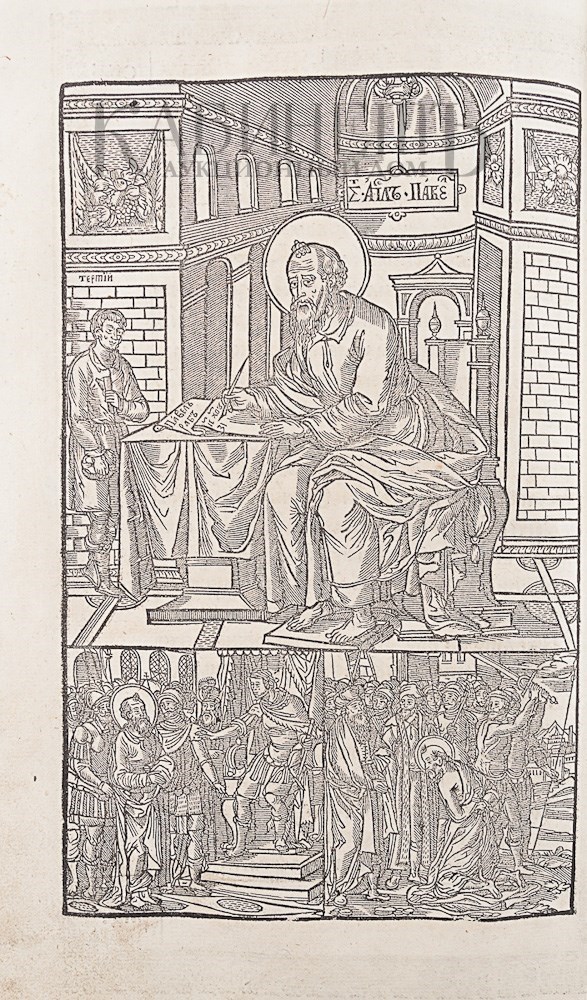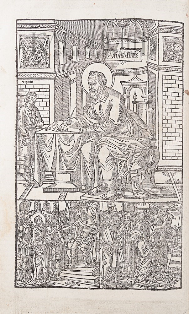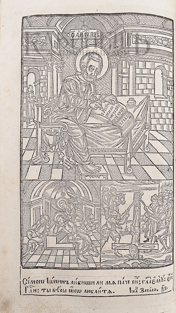 Печать в две краски. Страницы в гравированных рамках. Десять гравюр апостолов в лист (с 5 досок), 21 иллюстрация в тексте (с 21 досок) , 38 гравированных заставок, гравированные концовки и инициалы. В Апостоле использовались доски из Апостола Петра Могилы, изданного в 1639 году в той же типографии.