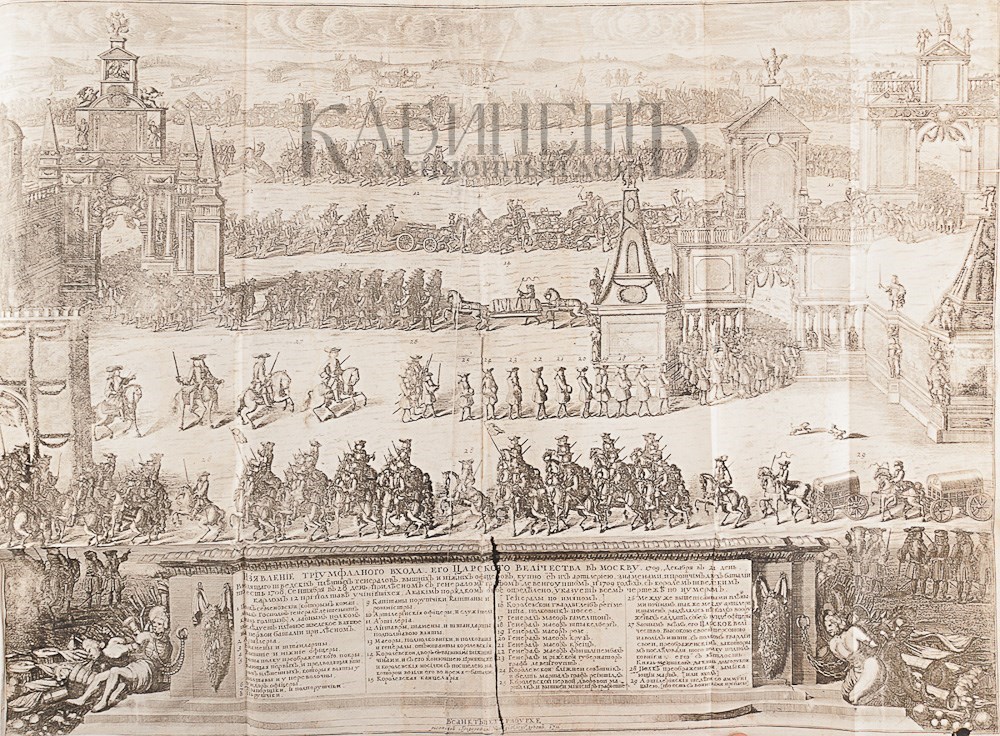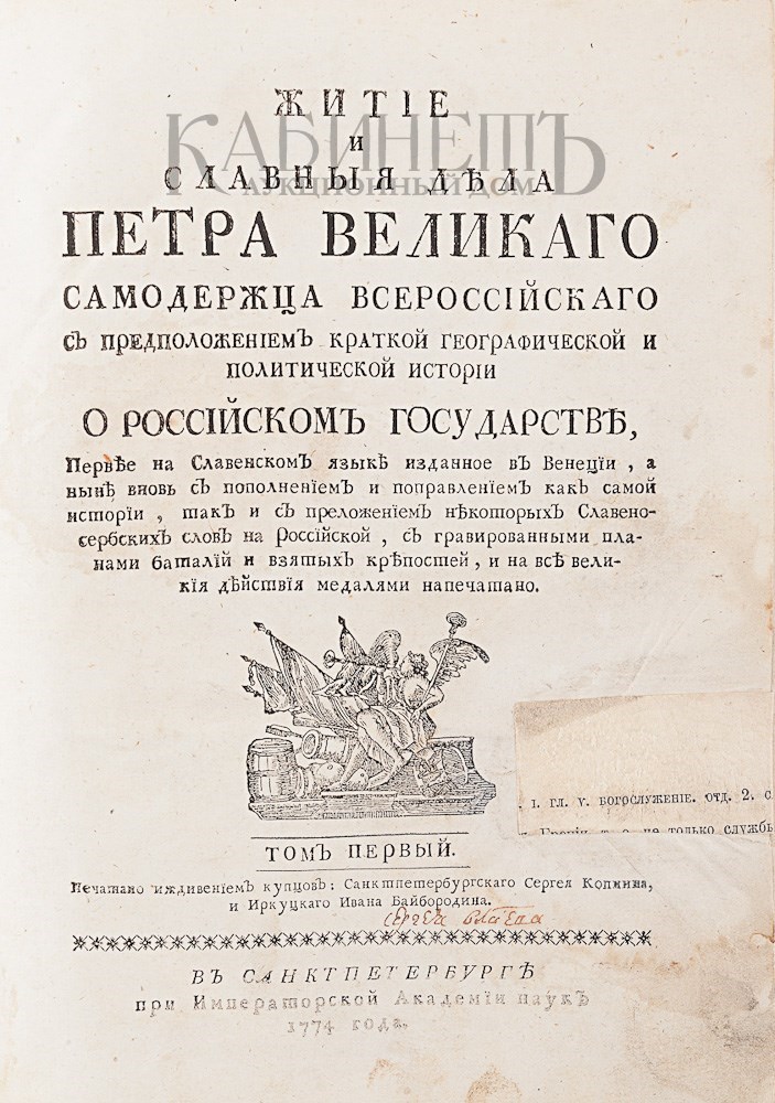 1) [Орфелин З.] Житие и славные дела Петра Великого, самодержца Всероссийского с предположением краткой географической и политической истории о Российском государстве, первее на славянском языке изданное в Венеции, а ныне вновь с пополнением и поправлением как самой истории, так и с преложением некоторых славено-сербских слов на Российской, с гравированным планами баталий и взятых крепостей, и на все великия действия медалями напечатано. Печатано иждивением купцов Санкт-Петербургского Сергея Копнина, и Иркутского Ивана Байбородина. [Издание 2-е]. Том I. СПб., при Императорской Академии наук, 1774.