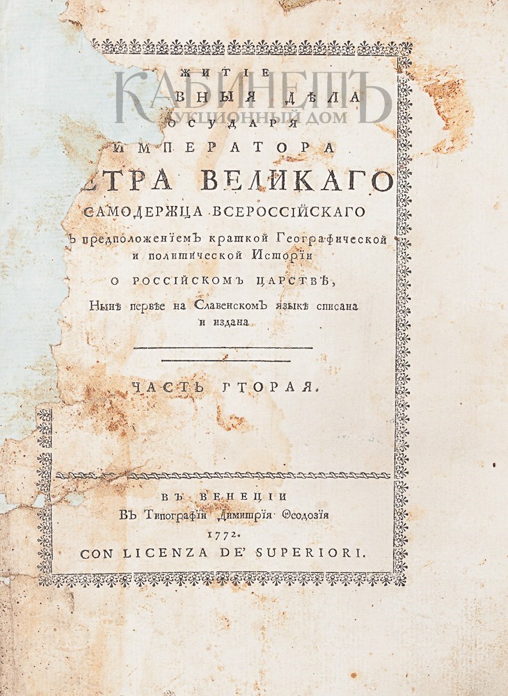 2) [Орфелин З.] Житие и славные дела Государя Императора Петра Великого, самодержца Всероссийского с предположением краткой географической и политической истории о Российском царстве, ныне первее на славянском языке списана и издана. Часть II. Венеция, в типографии Дмитрия Феодозия, 1772.