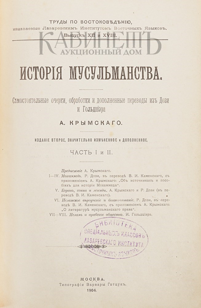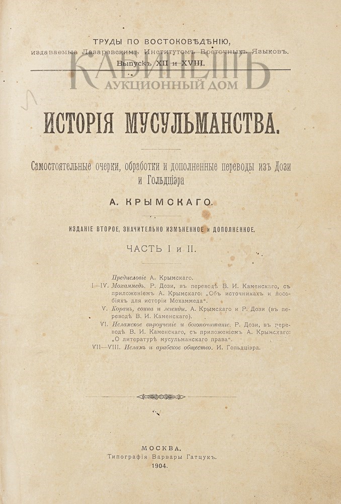 Крымский А. История мусульманства. Самостоятельные очерки, обработки и дополненные переводы из Дози и Гольдциэра. Часть I и II. Издание второе, значительно измененное и дополненное. Труды по востоковедению, издаваемые Лазаревским Институтом Восточных языков. Выпуск XII и XVIII. М., типография Варвары Гатцук, 1904.