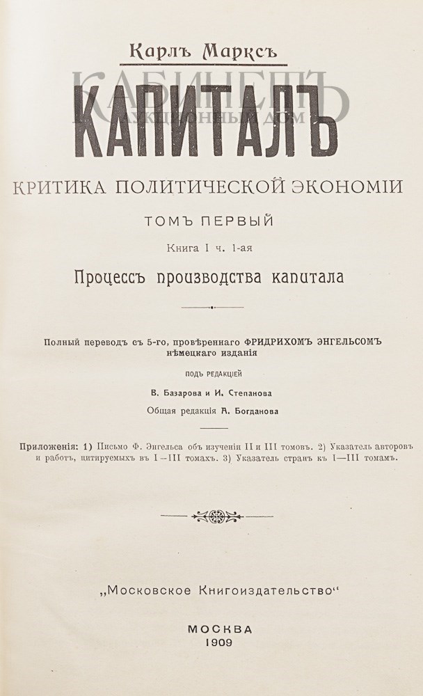 1) Маркс К. Капитал. Критика политической экономии. Полный перевод с 5-го, проверенного Фридрихом Энгельсом немецкого издания. В 5 томах. М., Московское Книгопроизводство, 1909.