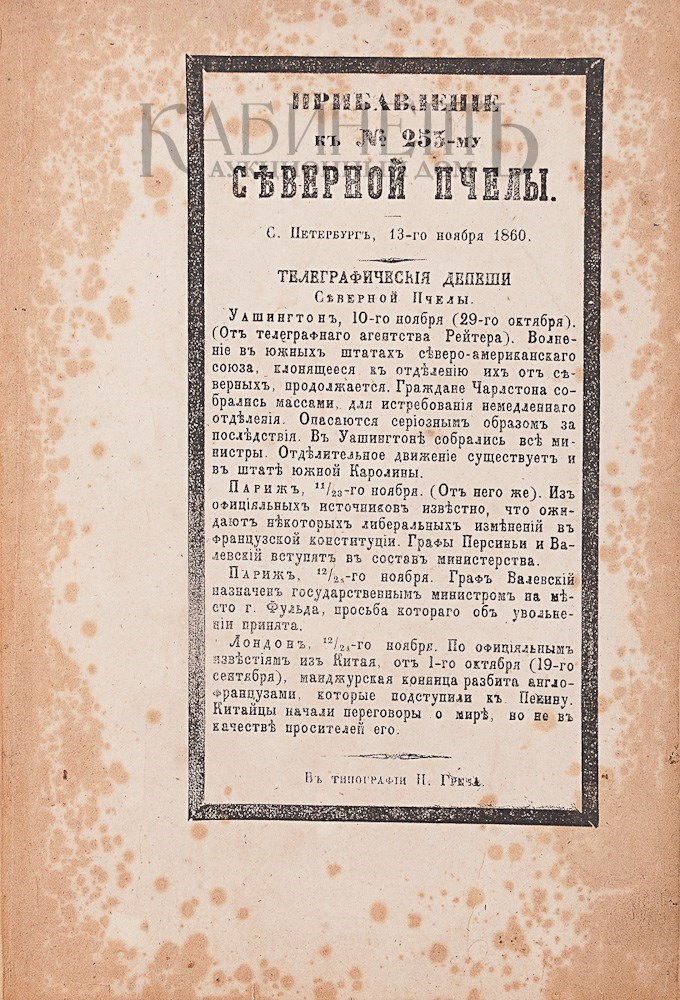 Экземпляр в бумажной издательской обложке. В экземпляр вложен вкладыш: «Прибавление к № 235-му Северной пчелы». Загрязнение обложки, лисьи пятна на страницах, Надрыв задней обложки у крепления блока, залом верхней обложки, надрывы по корешку, залом нижнего уголка задней обложки.