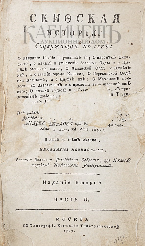 cодержащая в себе: О названии Скифии и границах ее; О народах Скифских, о начале и умножении Золотой Орды и о Царях бывших там; О Казанской Орде и Царях их, и о взятии города Казани; О Перекопской Орде или Крымской, и о Царях их; О Махомете прелестнике Агарянском и о прелести вымышленной от него; О начале Турков и о Султанах их, с приложением повести, о поведении и жительстве Турецких Султанов в Константинополе; Из разных иностранных историков, паче же из российских верных историй и повестей, от Андрея Лызлова прилежными труды сложена и написана лета 1692; издана Николаем Новиковым, Членом Вольного Российского Собрания, при Императорском Московском Университете. Издание второе. Часть II. М., Издание Н. Новикова, Типография Компании Типографической, 1787.