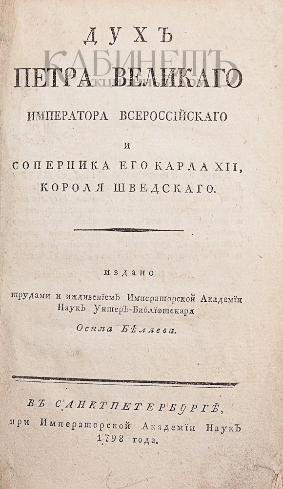Дух Петра Великого императора Всероссийского и соперника его Карла XII, короля Шведского. Издано трудами и иждивением Императорской Академии Наук Унтер–Библиотекаря Осипа Беляева. СПб., при Императорской Академии Наук, 1798.