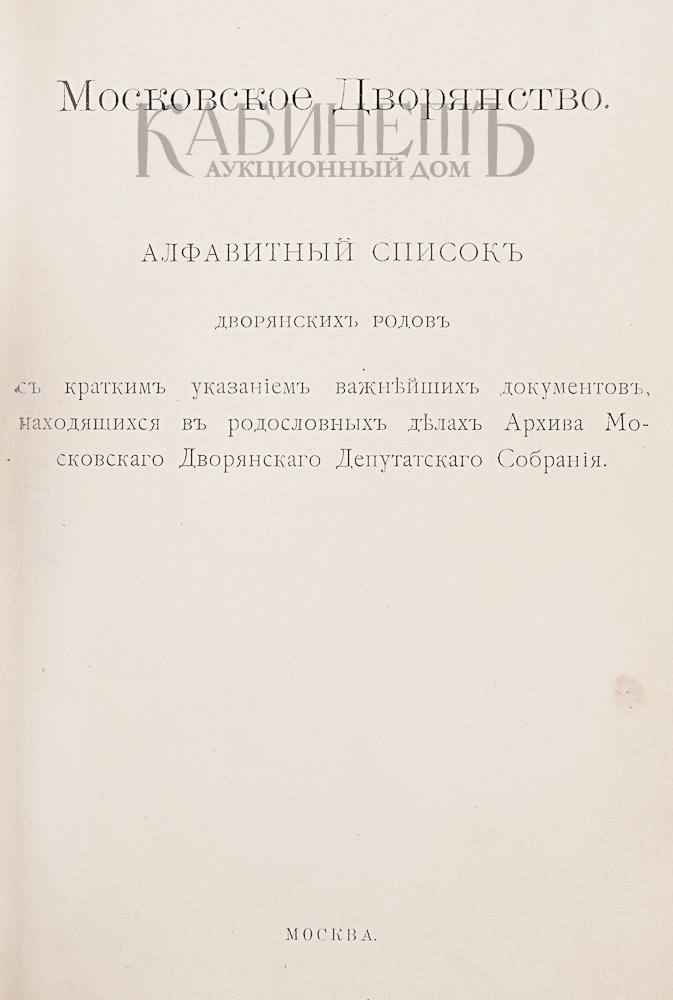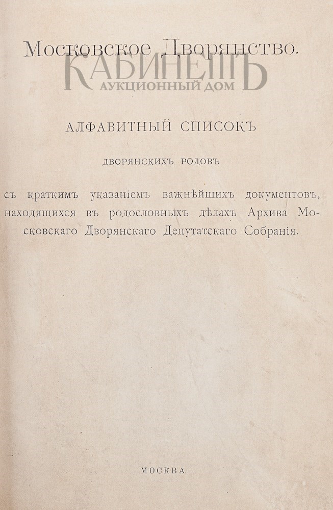 Московское дворянство. Алфавитный список дворянских родов с кратким указанием важнейших документов, находящихся в родословных делах Архива Московского Дворянского Депутатского Собрания. М., [б.м.], 1910.