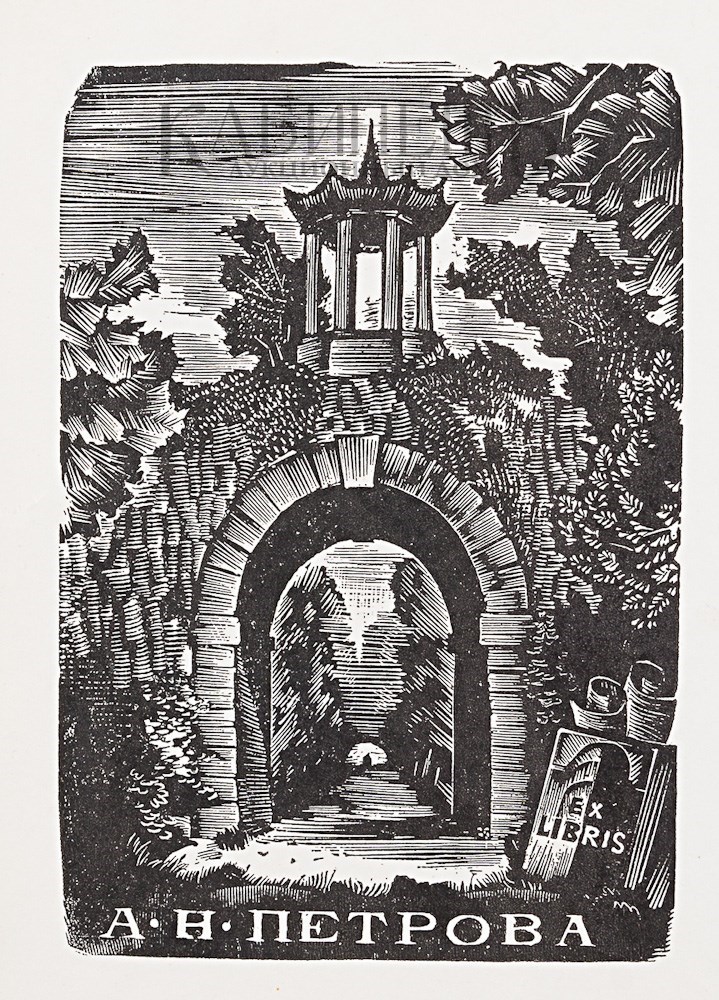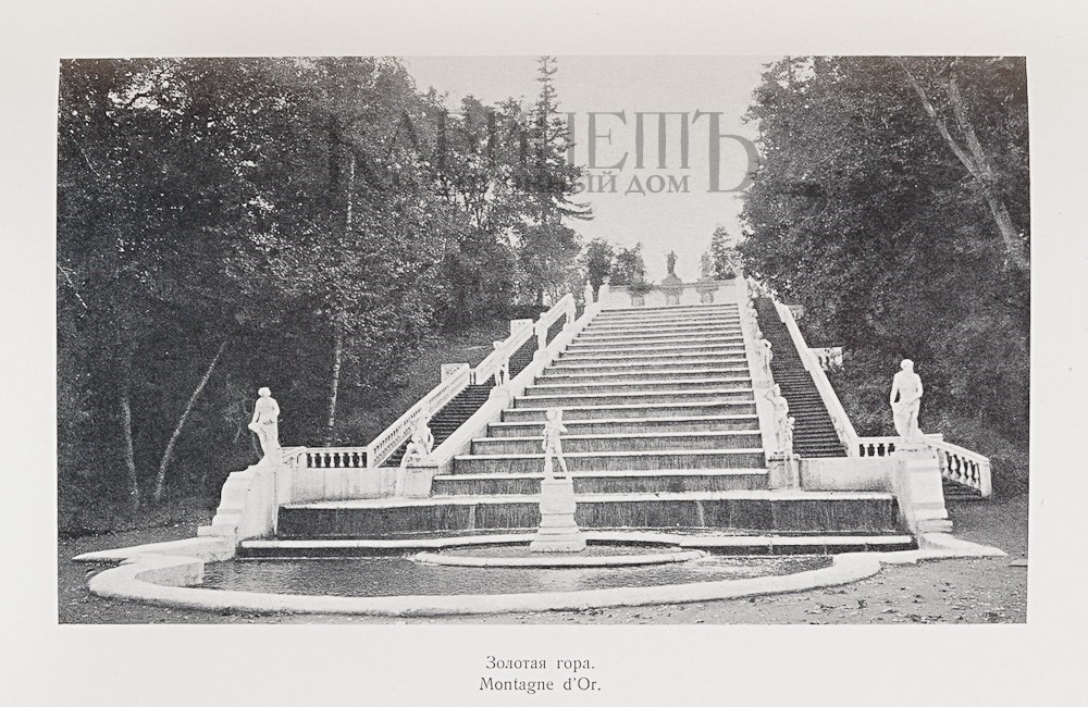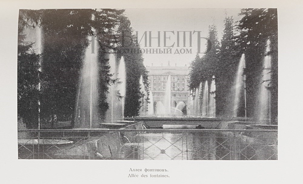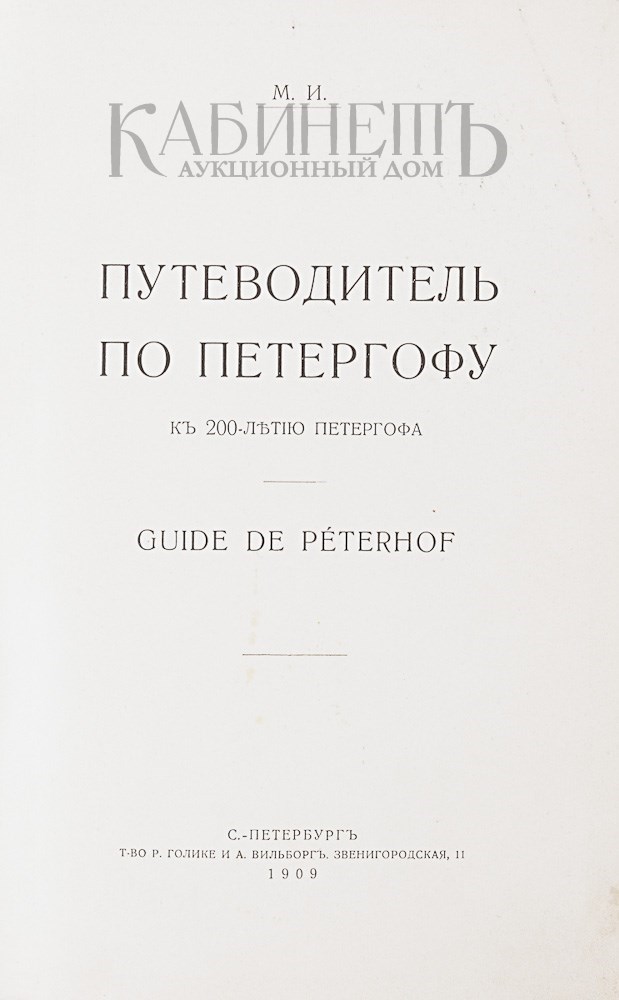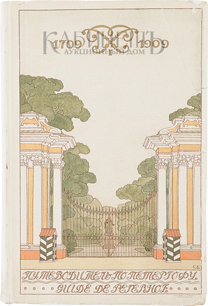 Два цветных раскладных плана Петергофа и окрестностей: один помещен в специальный карман задней переплетной крышки, другой прикреплен к последней странице. На форзаце гравированный сюжетный экслибрис А.Н. Петрова. Залом верхнего правого угла верхней обложки. Небольшие надрывы по правому краю обложки, потертости уголков.